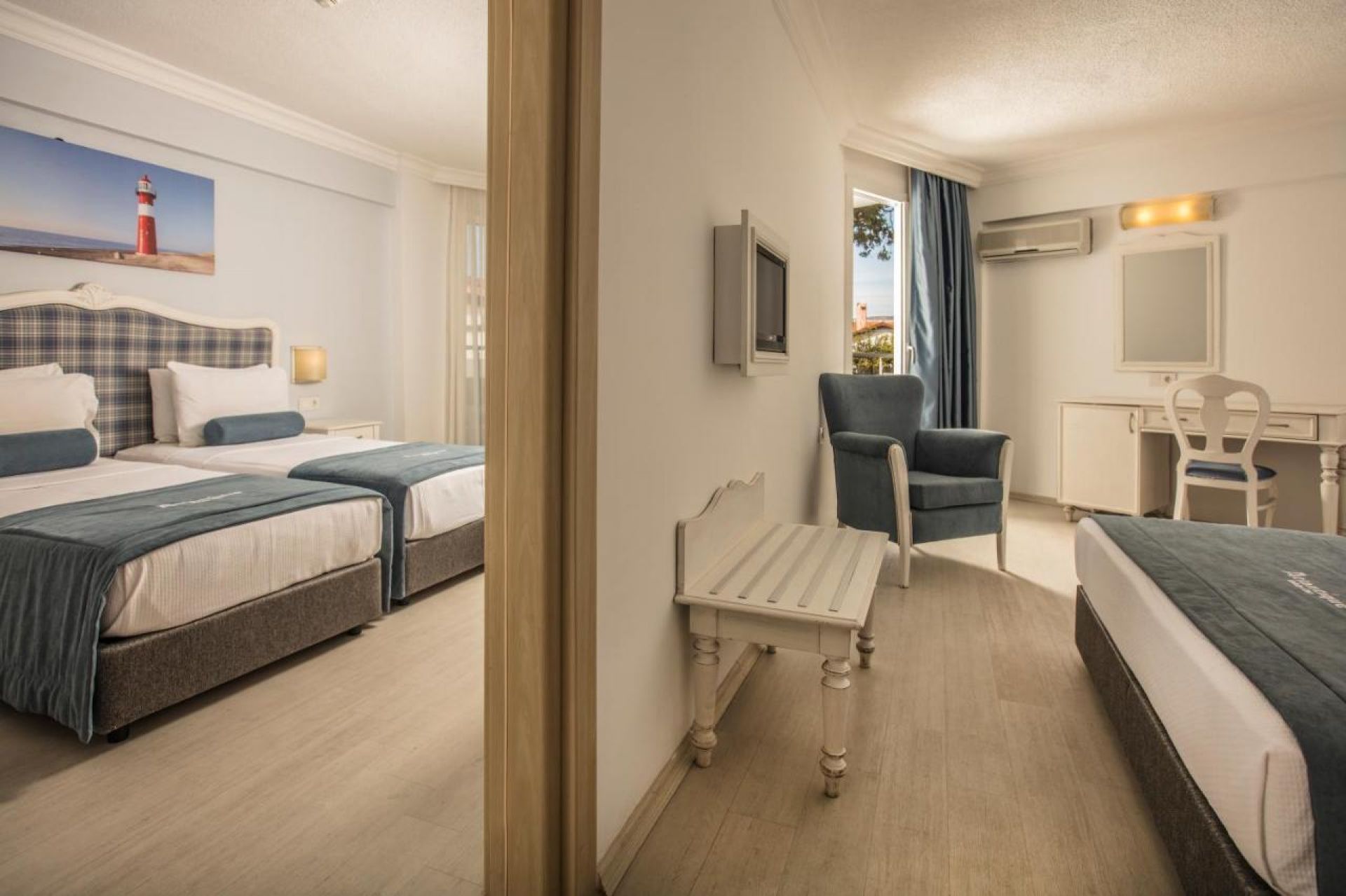 Хотелът разполага с 354 стаи, от които 250 стандартни стаи с изглед градина или с изглед море (20-23 м²), 68 фамилни стаи (две свързани помещения и с две бани, 44-46 м²), 30 стандартни стаи с джуетажни легла (23 м²), 4 апартамента (спалня, всекидневна, баня с джакузи, 44 м²) и 4 стаи за инвалиди. Всички стаи са оборудвани с климатик, телевизор, телефон, баня с душ, сешоар, сет за чай/кафе, минибар (безплатен), сейф (безплатен), балкон или тераса, Wi-Fi интернет.