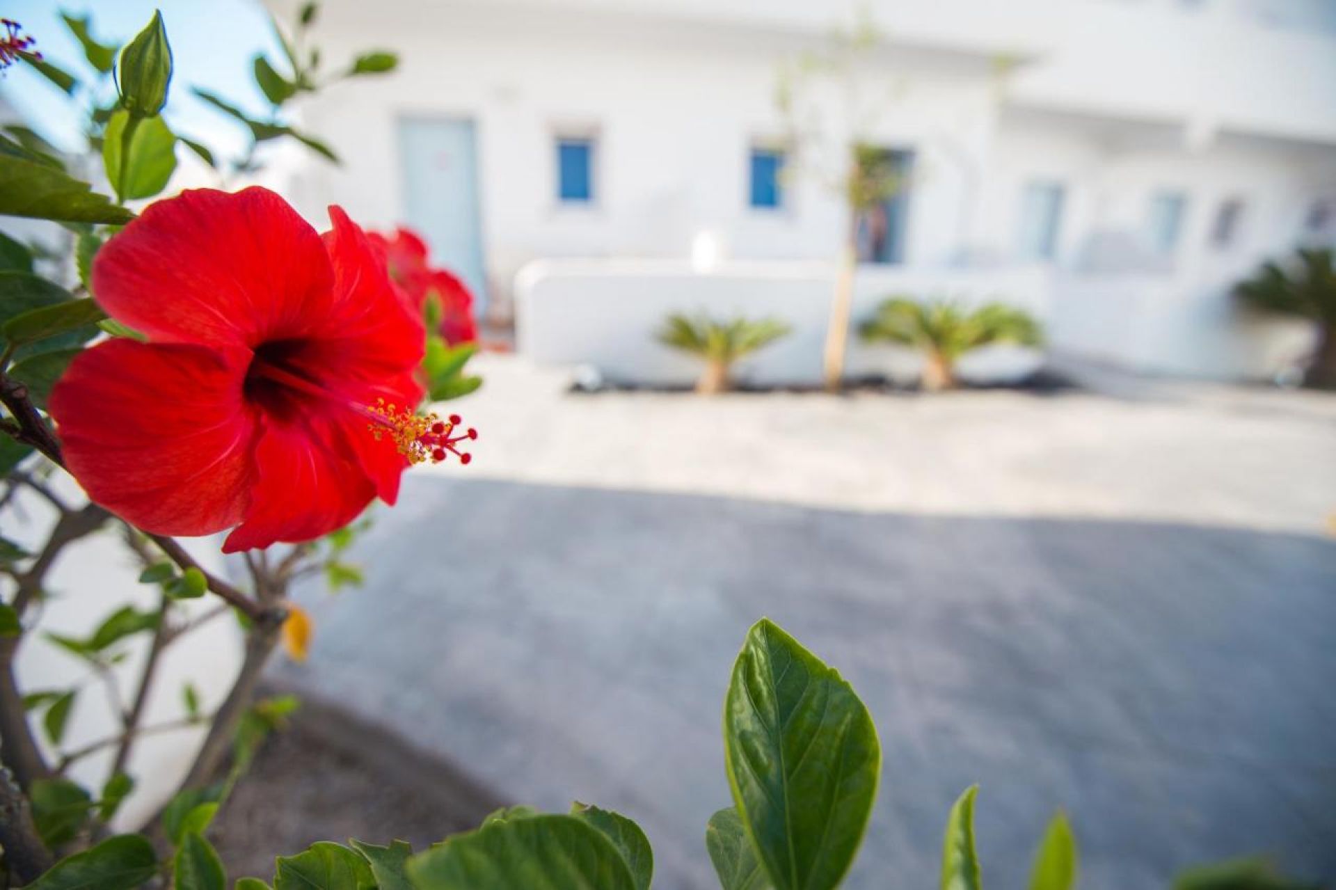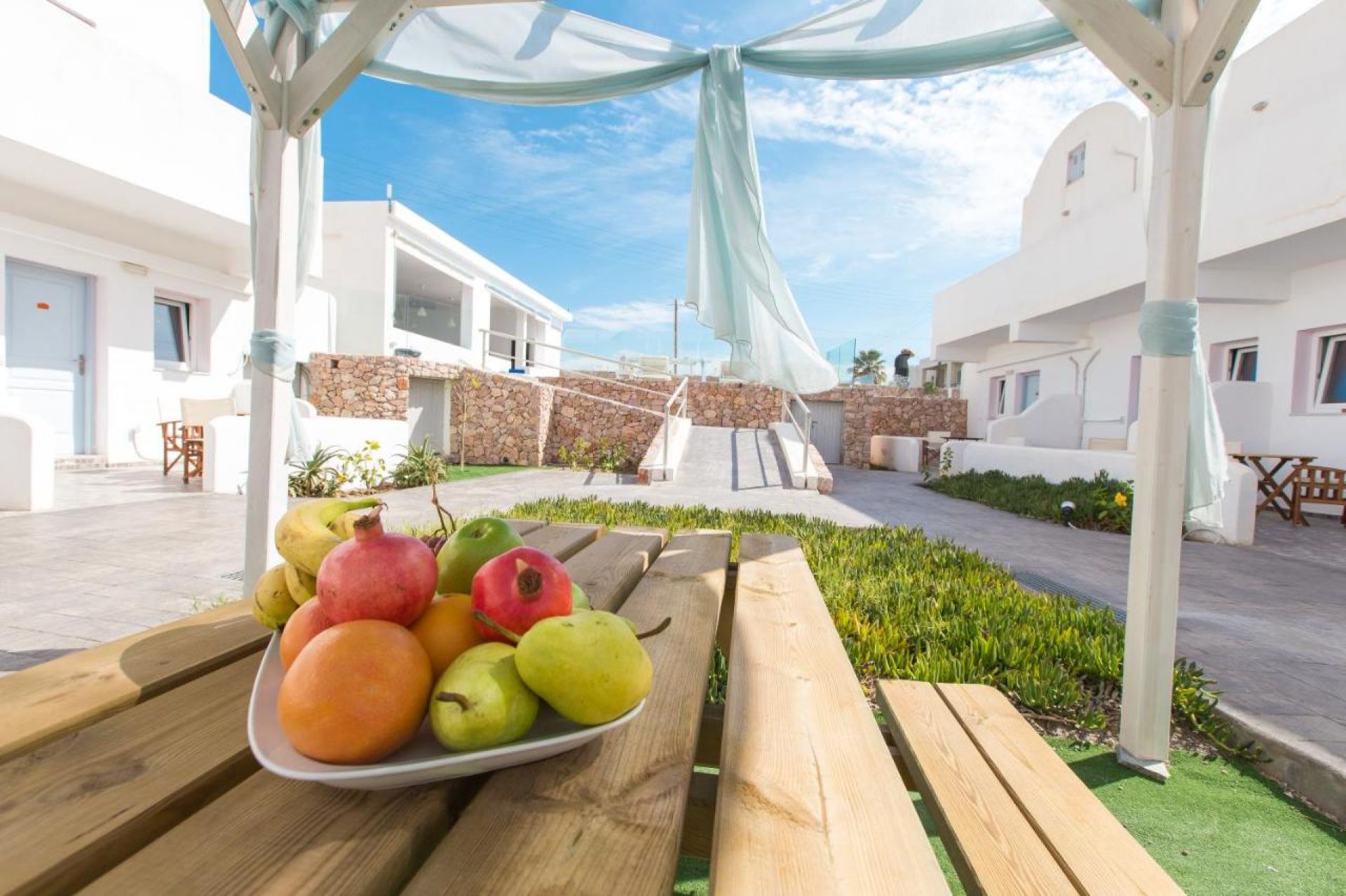 Хотелът се намира в района на Периса-Периволос, само на няколко крачки от най-хубавият пясъчен плаж на острова. Периса е 800 метра, столицата Фира на 10 км, централното пристанище Атиниос е на 7 км. Автобусна спирка на градски транспорт има на 1 минута от хотела. За всички трансфери и екскурзии, качването на туристи става директно от хотела !