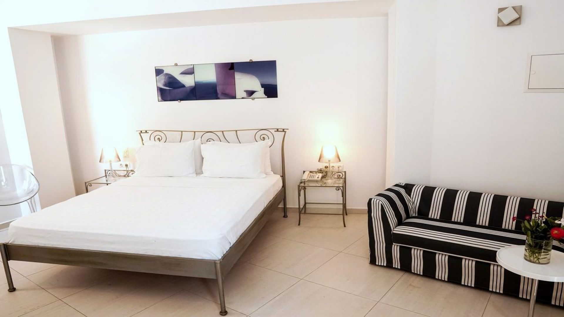 Някои от стаите са с гледка към морето, а други с гледка към градините на хотела.