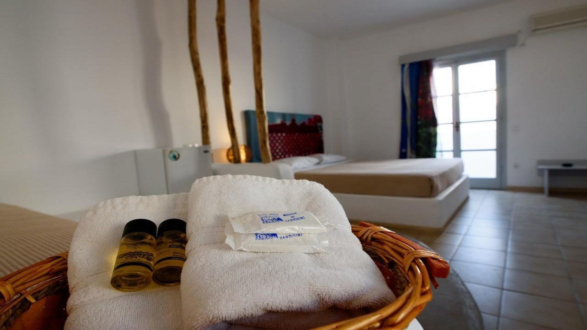 Всички стаи са декорирани в модерен цикладски архитектурен стил и разполагат с всички удобства, от които се нуждаете. Стаите са снабдени с климатик, телевизор с плосък екран със сателитни канали, хладилник, сейф, сешоар, собствена баня с душ, тоалетни принадлежности, балкон или тераса.