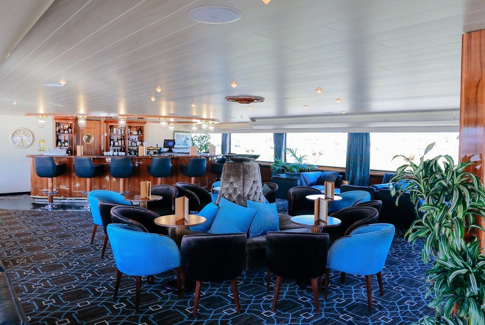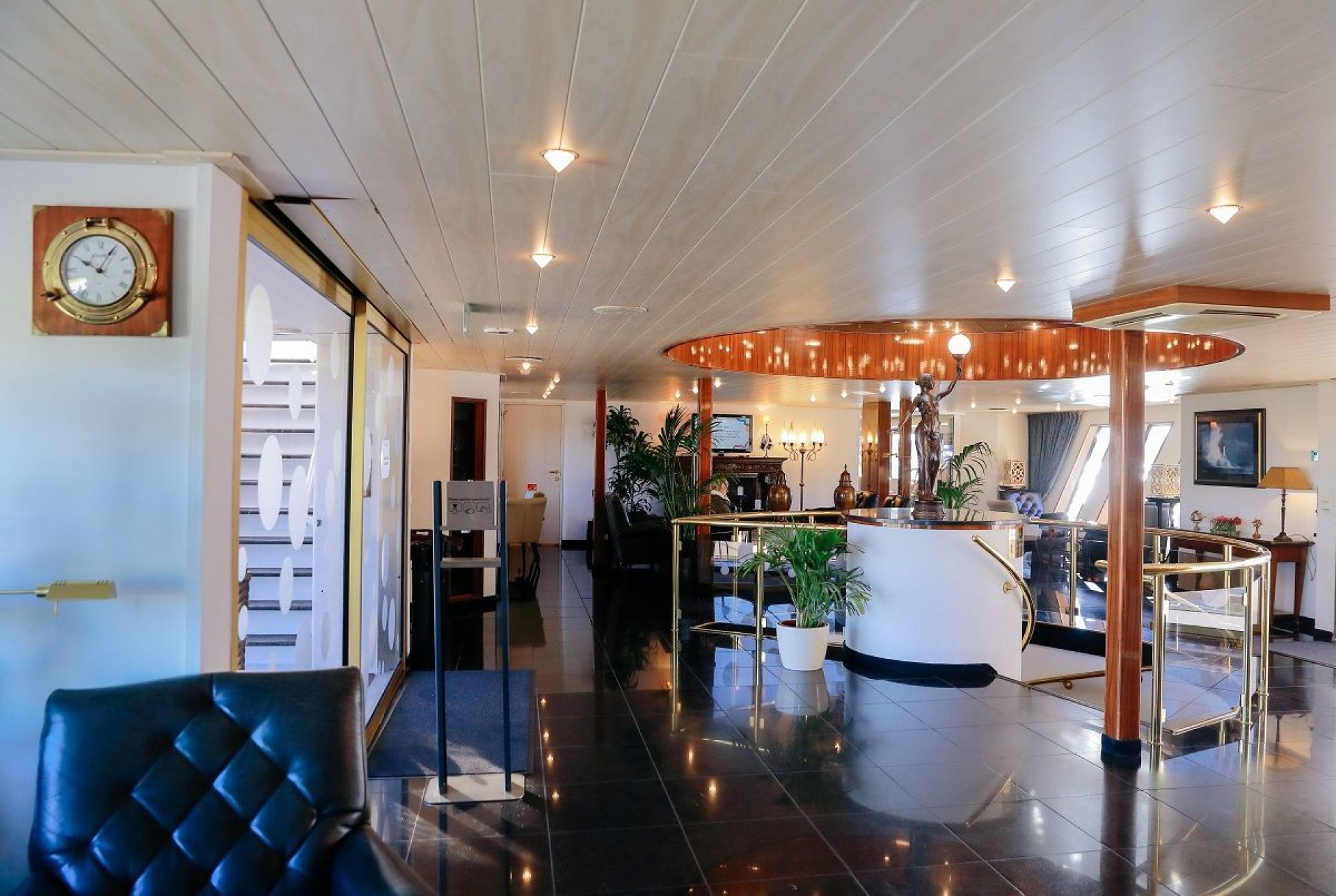 На разположение на гостите са ресторант, бар, зона с камина и кресла, машина за кафе и чай на самообслужване през целия ден, библиотека, сауна и фитнес, слънчева тераса със шезлонги, безжичен интернет срещу заплащане. Корабът разполага с 3 палуби, капацитетът е 110 гости.