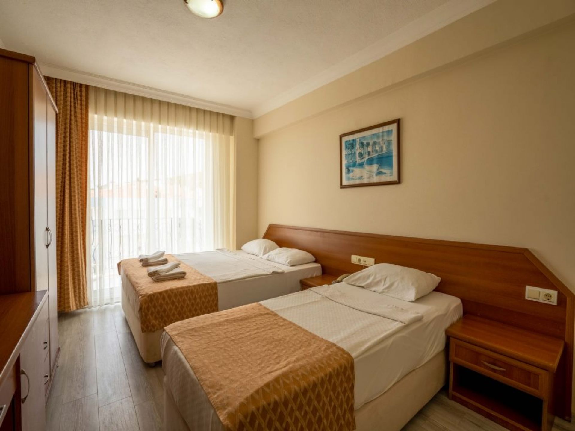 Хотелът разполага с 127 стаи/спалня и единично легло/. Всички стаи са оборудвани с климатик, телевизор, телефон, баня с душ или вана, сешоар, мини бар, сейф, балкон или тераса. Почистване на стаите - всеки ден, смяна на спалното бельо и кърпите - 2 пъти в седмицата.