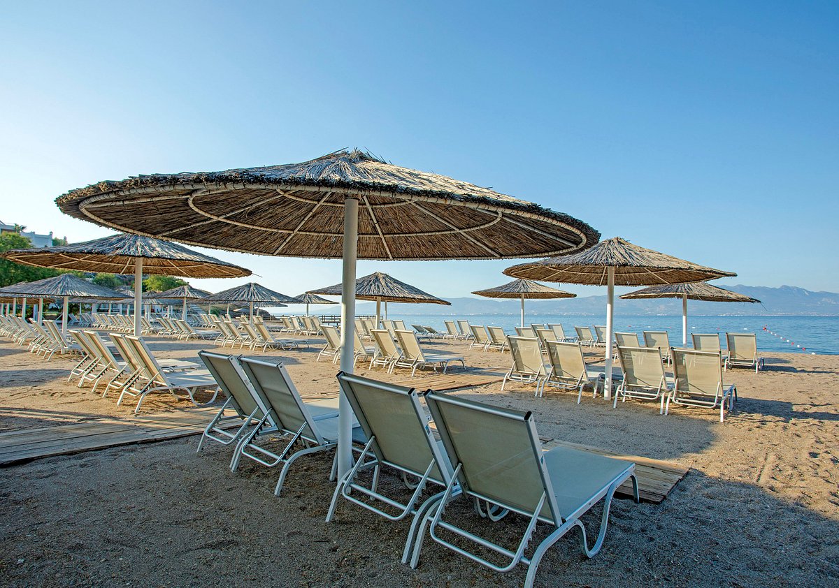 Собствен, пясъчен. Чадъри, шезлонги, матраци и плажни кърпи на плажа и при басейна - безплатно.