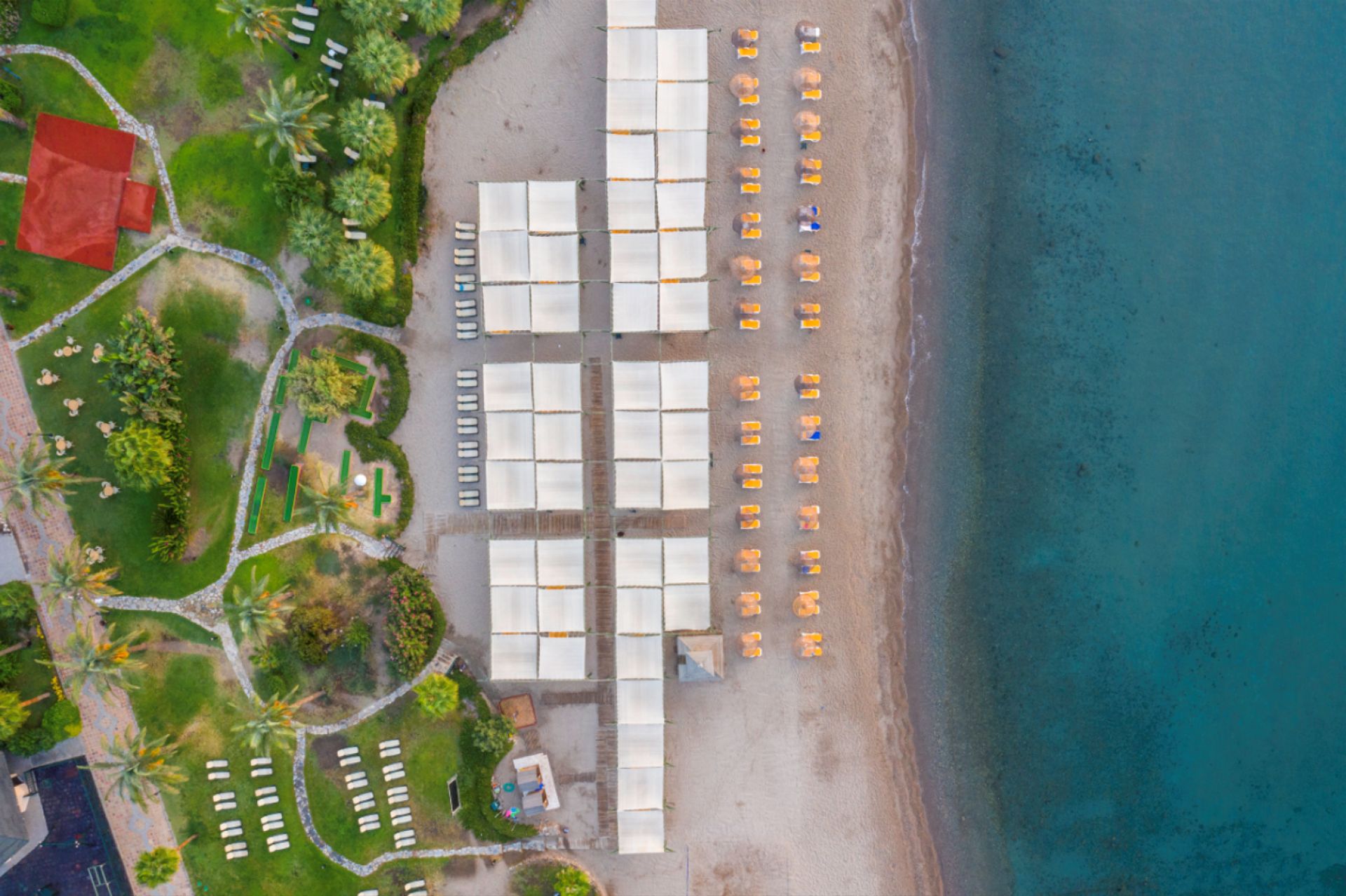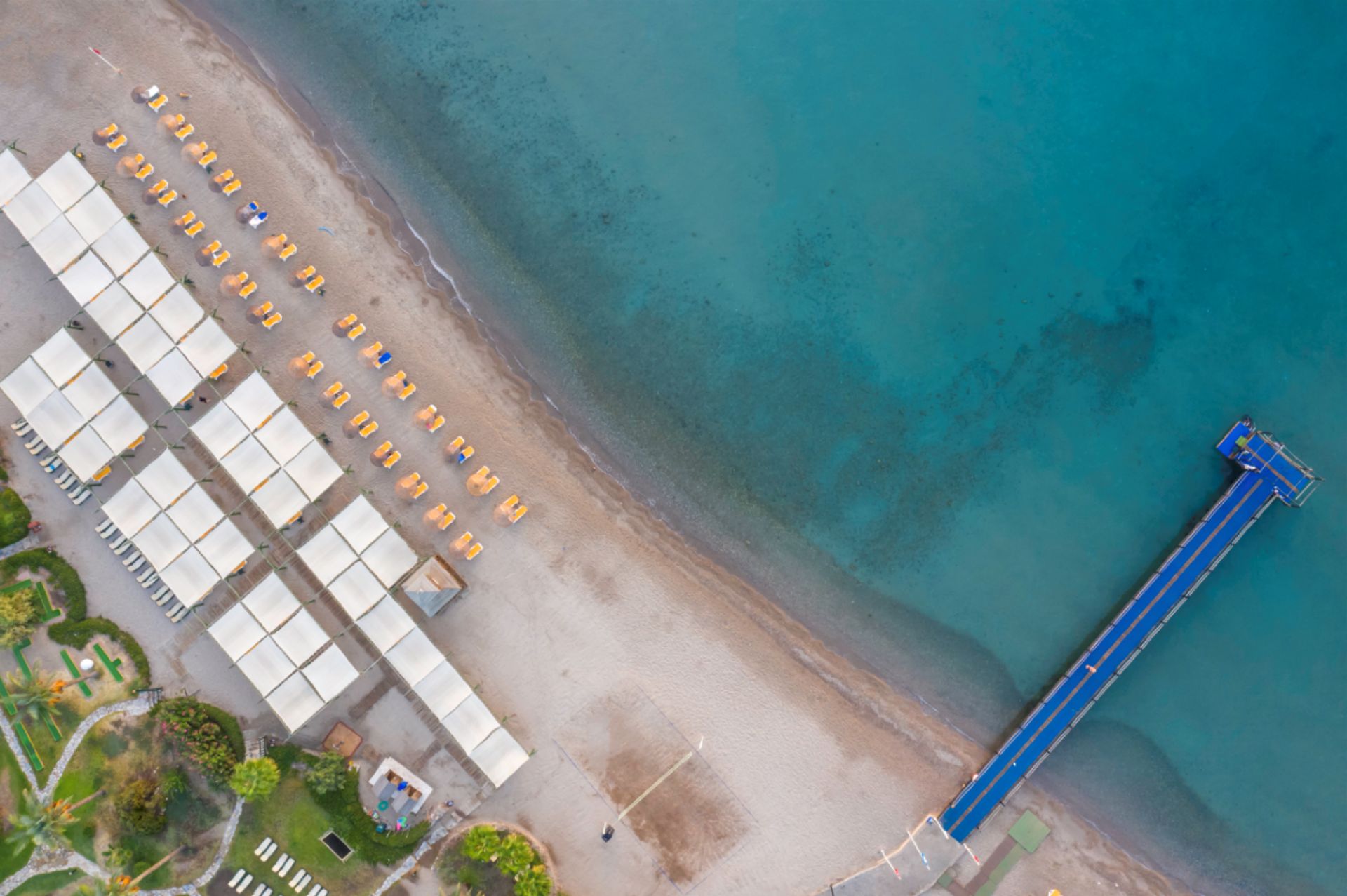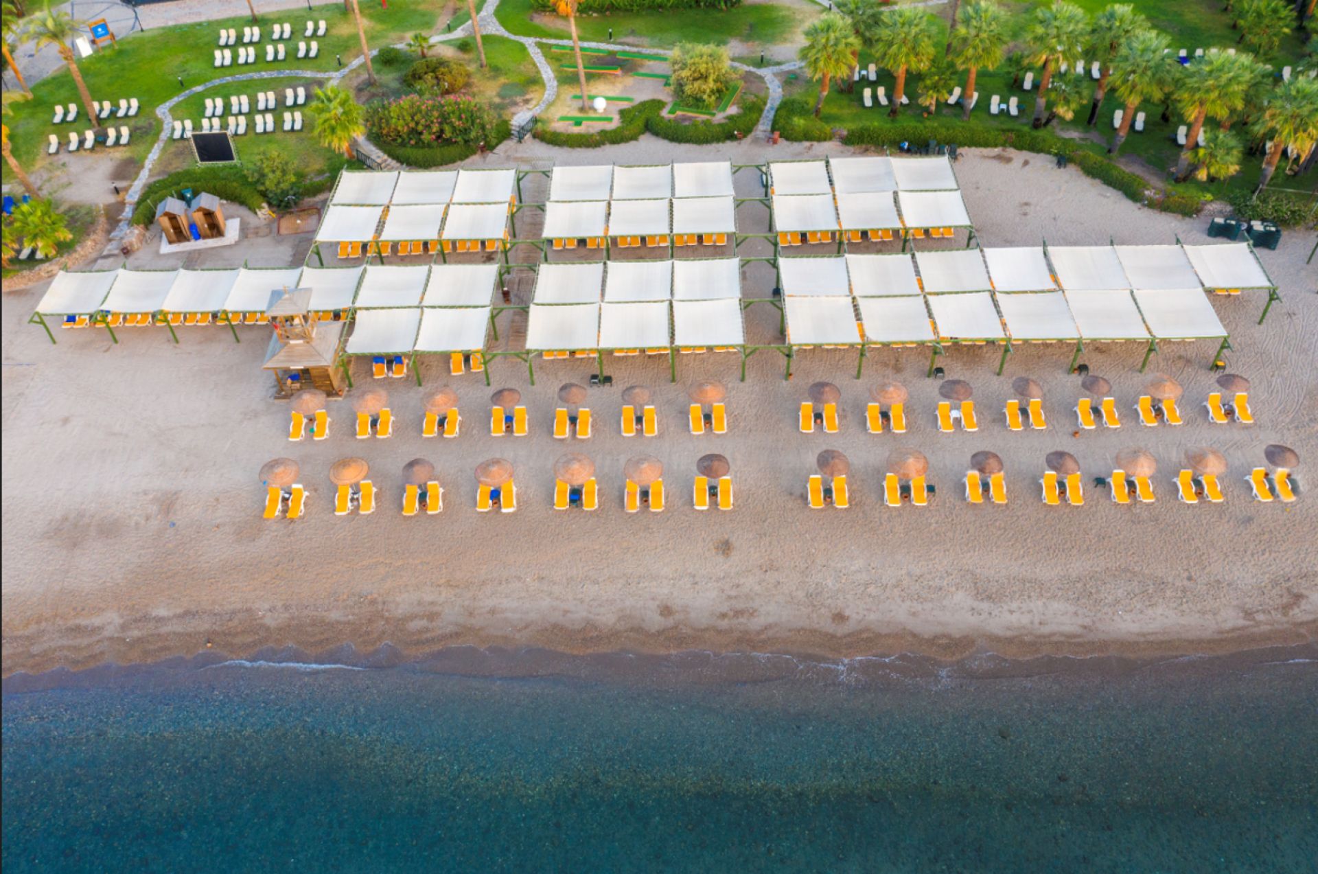 Собствен, пясъчен. Чадъри, шезлонги, матраци и плажни кърпи на плажа и при басейна - безплатно.