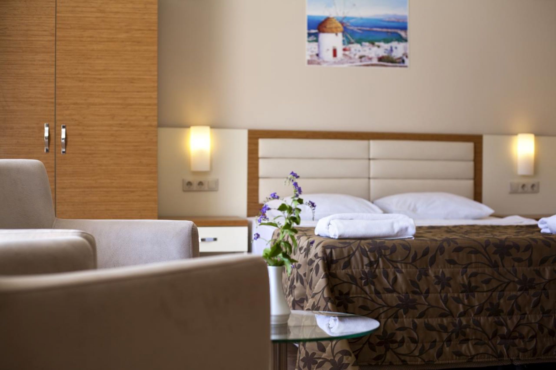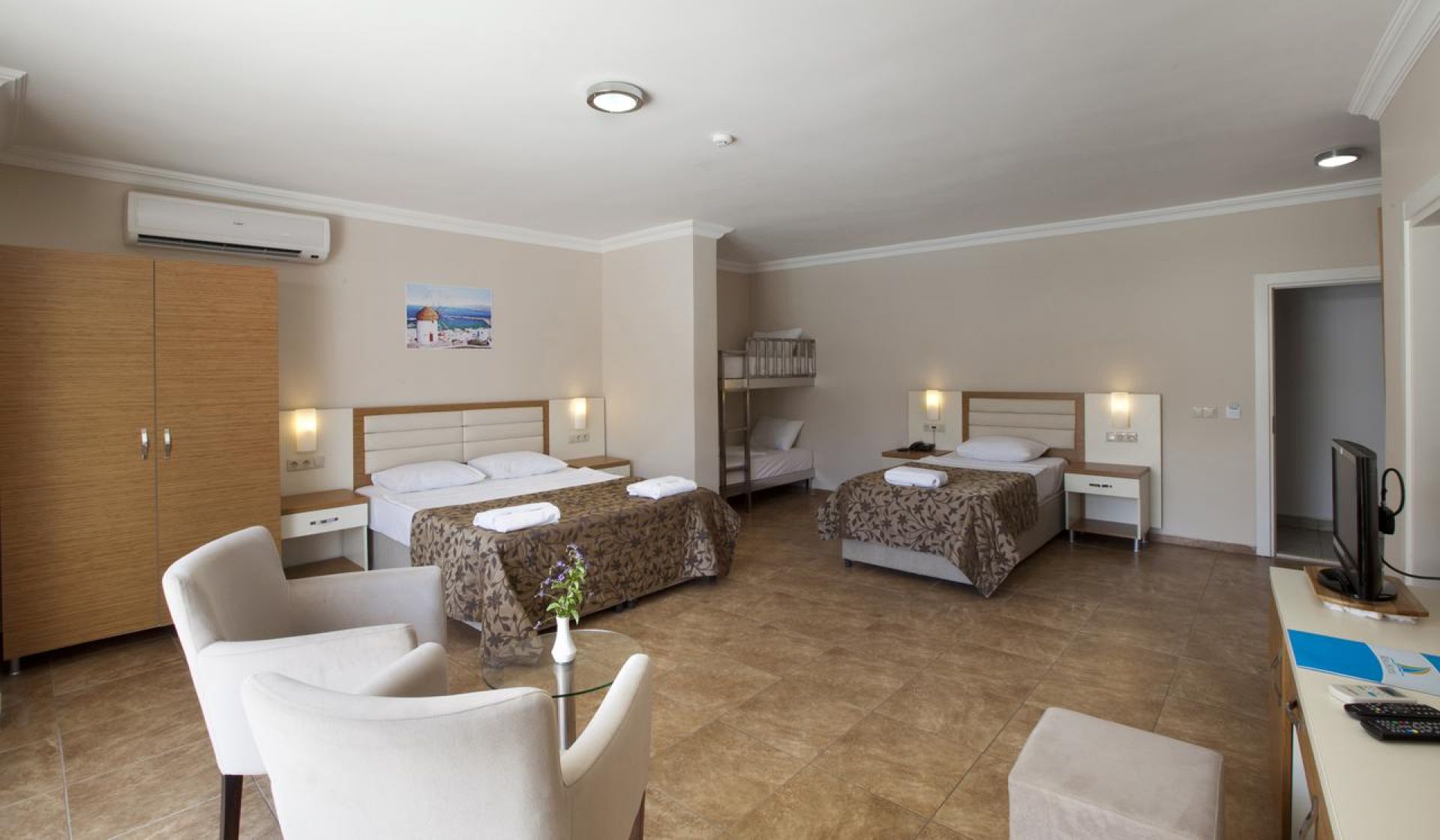 Хотелът разполага с общо 90 стаи, разположени в 3-етажна сгради, от които 70 Standard room (17 м²), 20 Large Room (спалня и двуетажно легло - 35 м²). Всички стаи са оборудвани с климатик, телевизор, телефон, баня с душ, сешоар, сет за чай/кафе, минибар (наличен само в деня на настаняване; безплатен за гости на All Inclusive), сейф (безплатен).