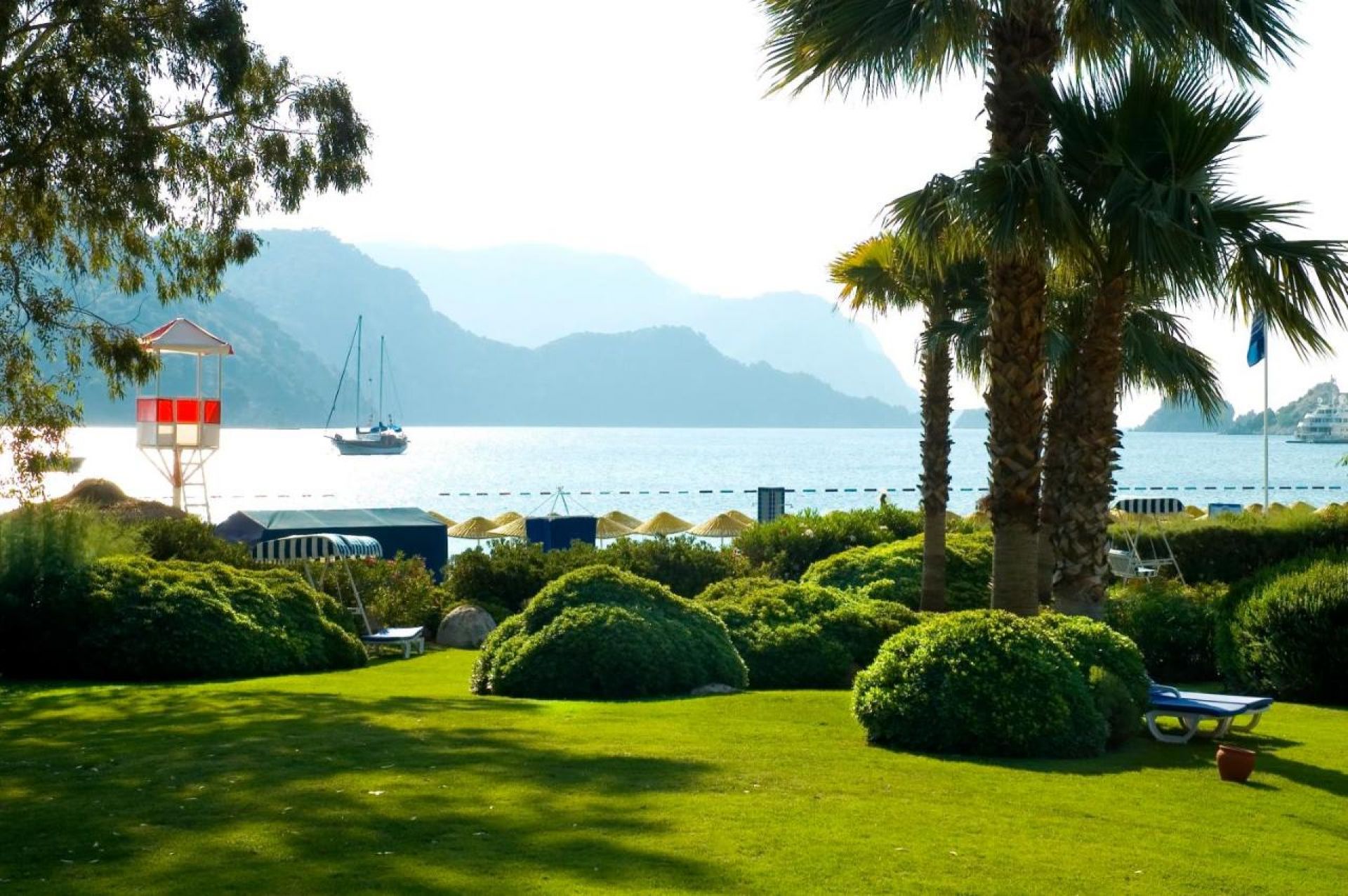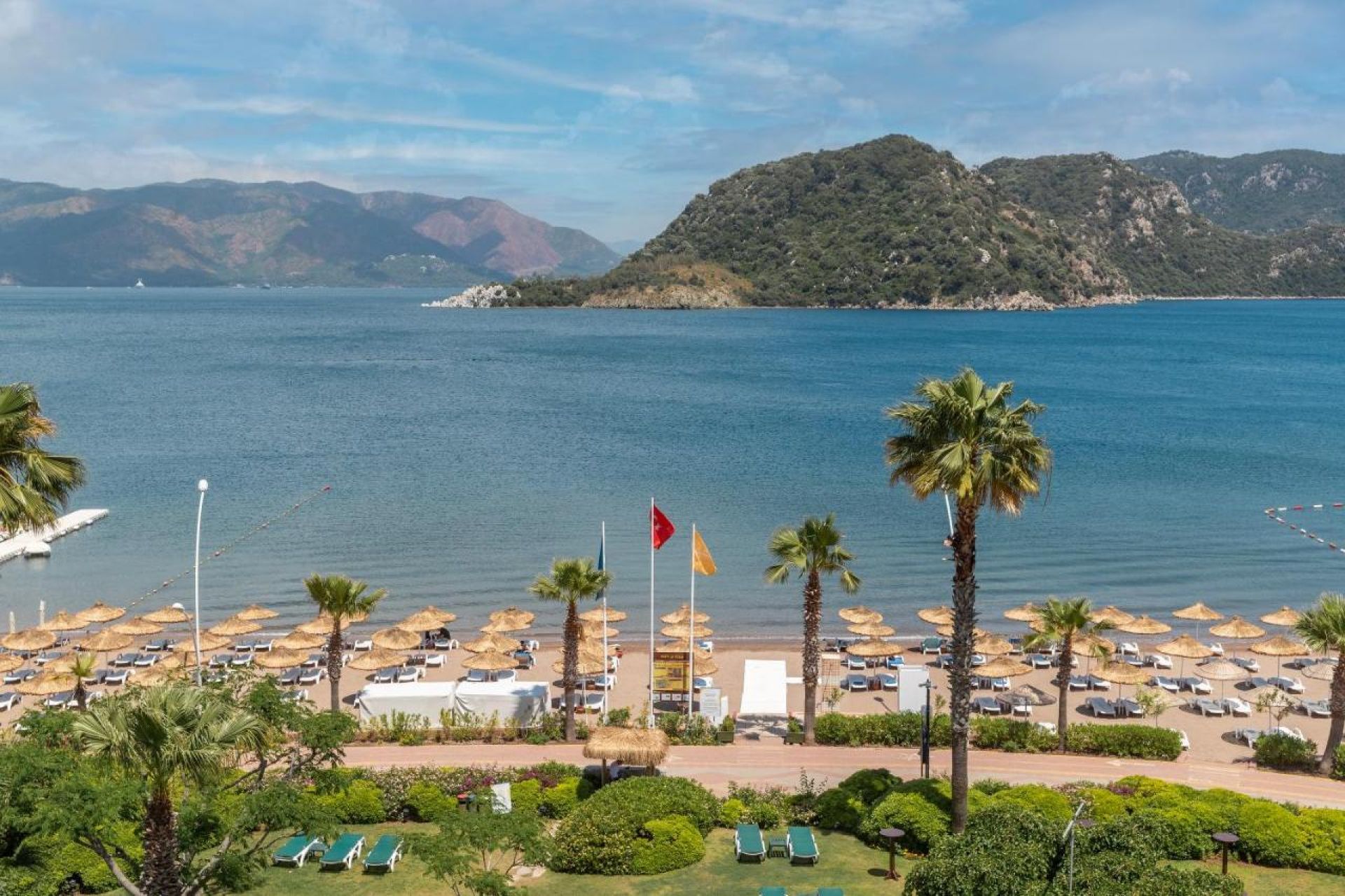 Собствен, пясъчен удостоен със сертификат "Син флаг" .Чадъри и шезлонги на плажа и при басейна – безплатно, плажни кърпи - безплатно.