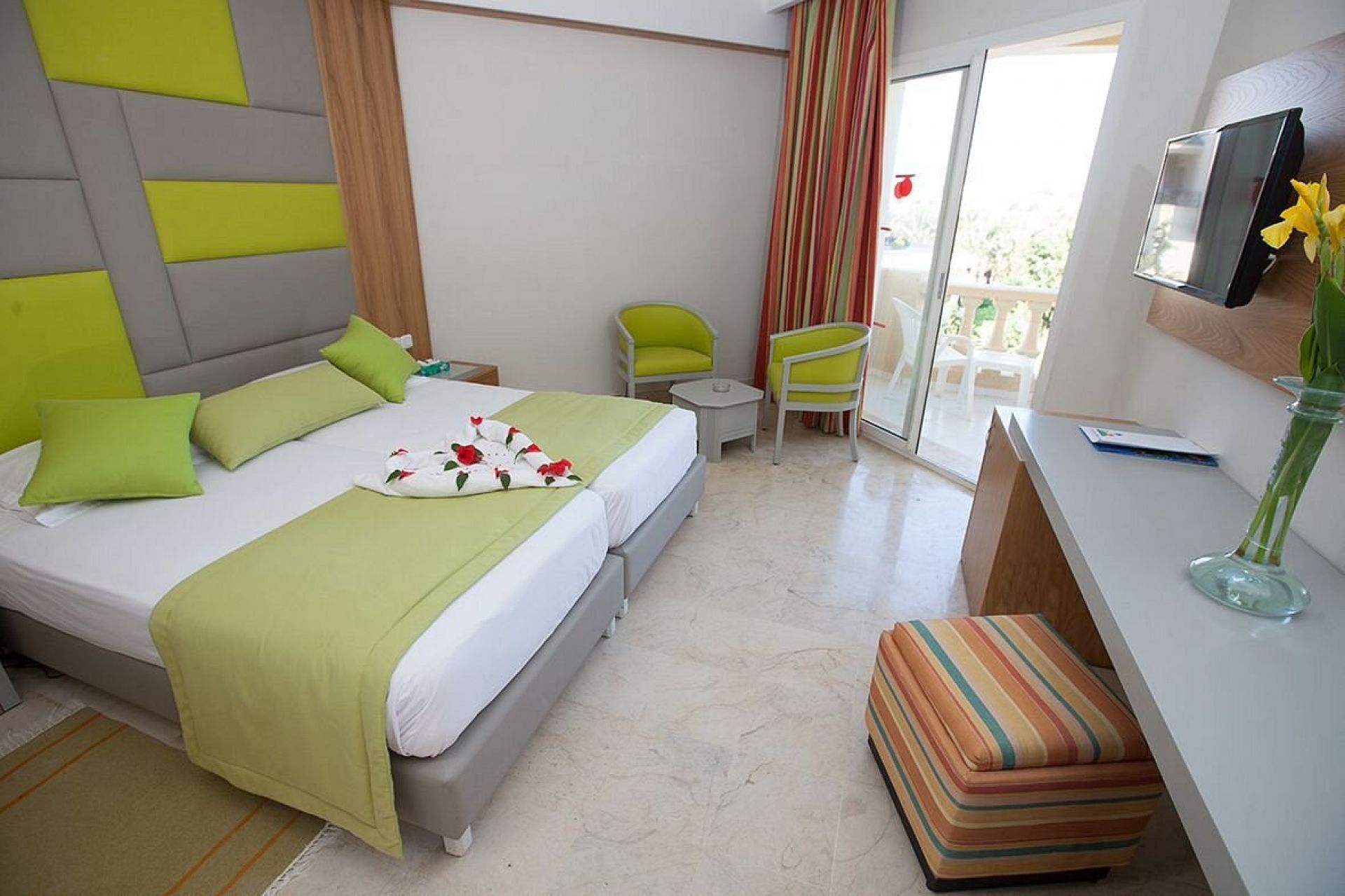 Всички стаи са оборудвани с климатик, телевизор, баня с душ/вана, сешоар, мини бар (празен), сейф (платен), балкон (не във всички стаи). Почистване на стаите и смяна на кърпите – всеки ден, смяна на спалното бельо – 2 пъти в седмицата.