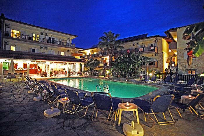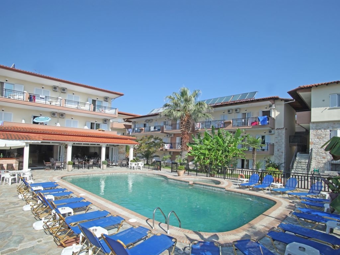 Местоположение: "Sarantis" се намира в селището Ханиоти, на първия ръкав на Халкидики - Касандра. Разположен е на площ от две хиляди квадратни метра, само на 300 м от плажа и на 150 м от центъра на Ханиоти.