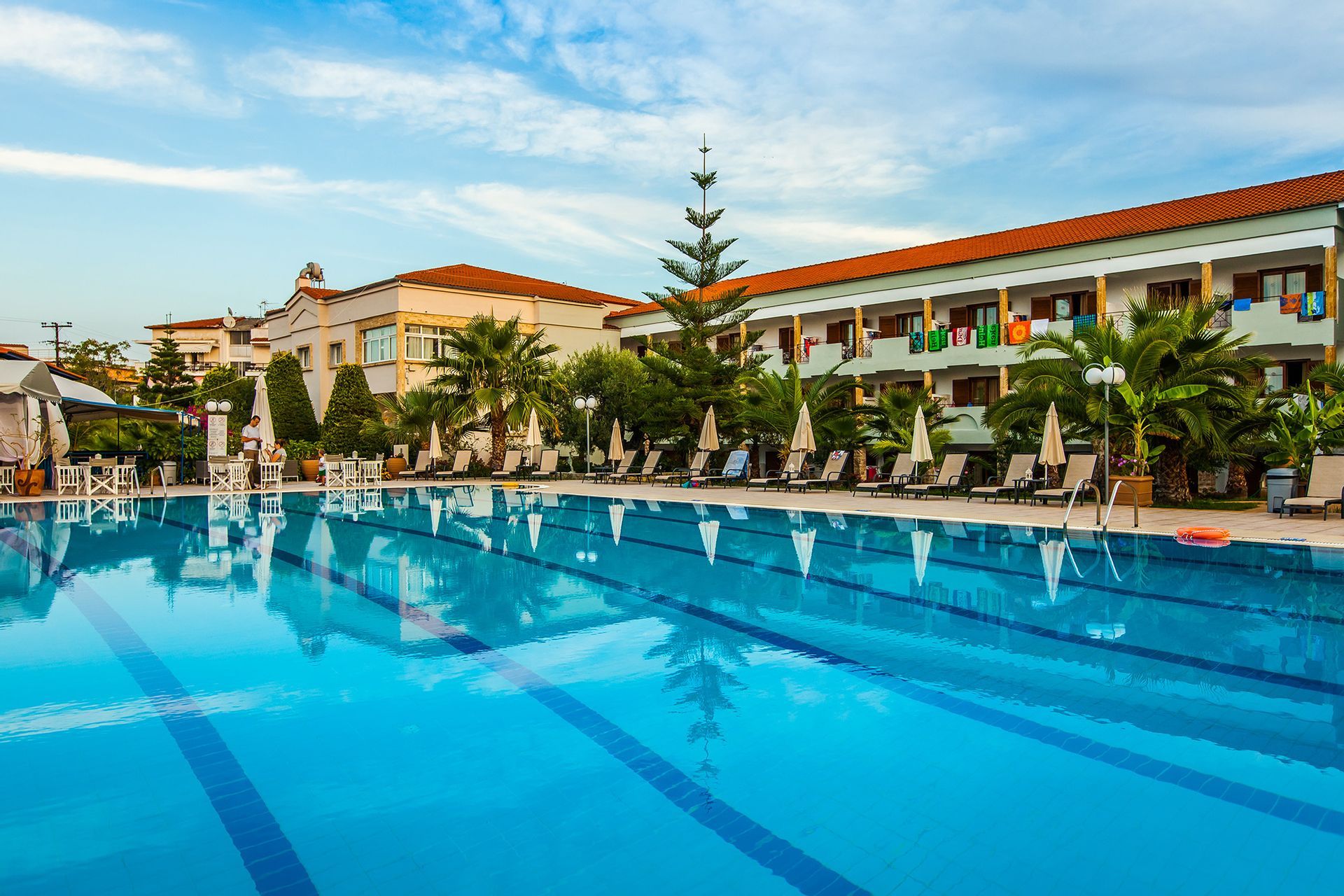 Разположение: Хотелът се намира в центъра на Ханиоти, едно от много оживените селища на първия ръкав на халкидическия полуостров – Касандра. Разстоянието до Солун е 98 км., разстоянието до плажа е 300 м. Състои се от две съседни сгради.
