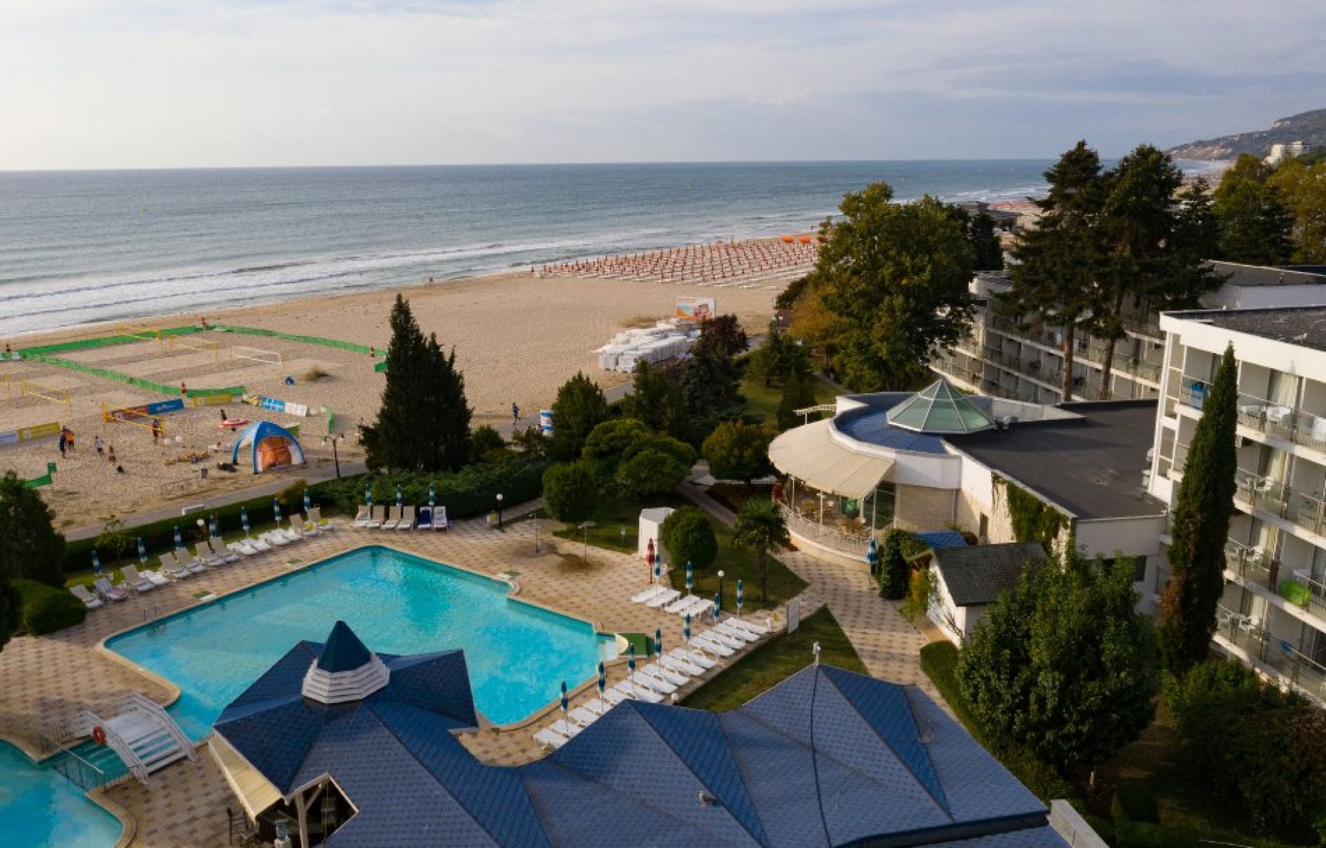 Чадъри и шезлонги на плажа и при басейните (включени според политиката на курорта)