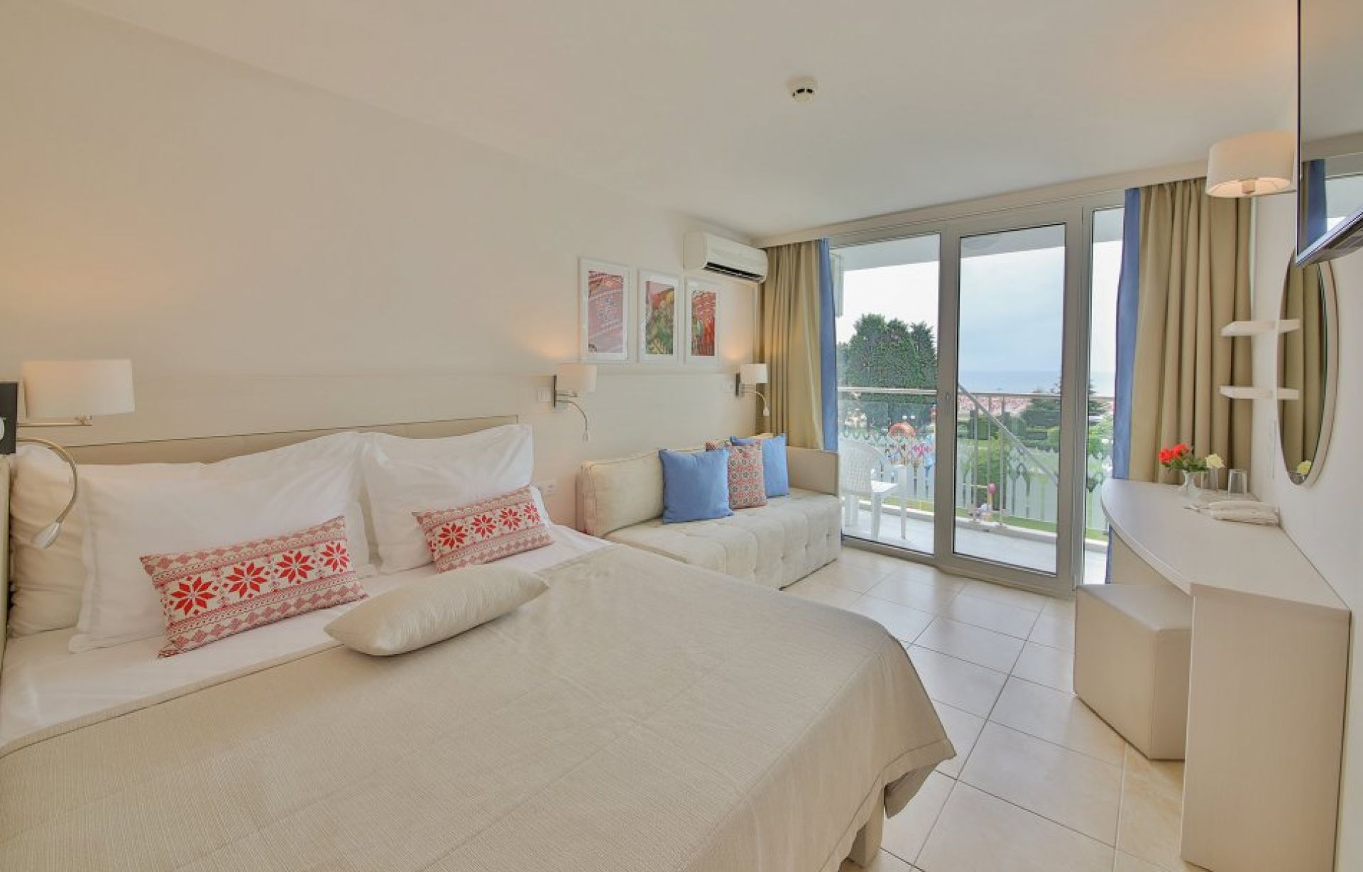 Настаняване в комфортна стая с основни удобства (климатик, телевизор, мини‑хладилник, Wi‑Fi, балкон, собствен санитарен възел)