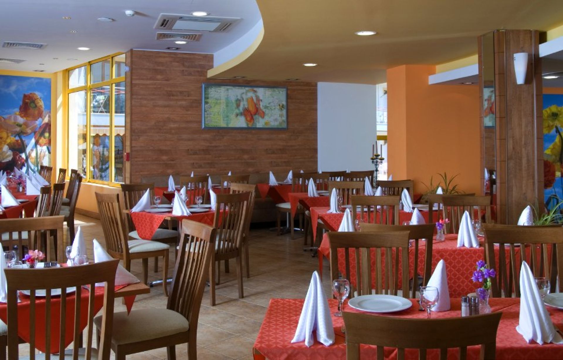 Ресторантът предлага All Inclusive изхранване с богати бюфети за закуска, обяд и вечеря, включително ястия от българската и международната кухня. За семействата има детски бюфети и менюта, а просторната обстановка осигурява комфорт за всички гости.