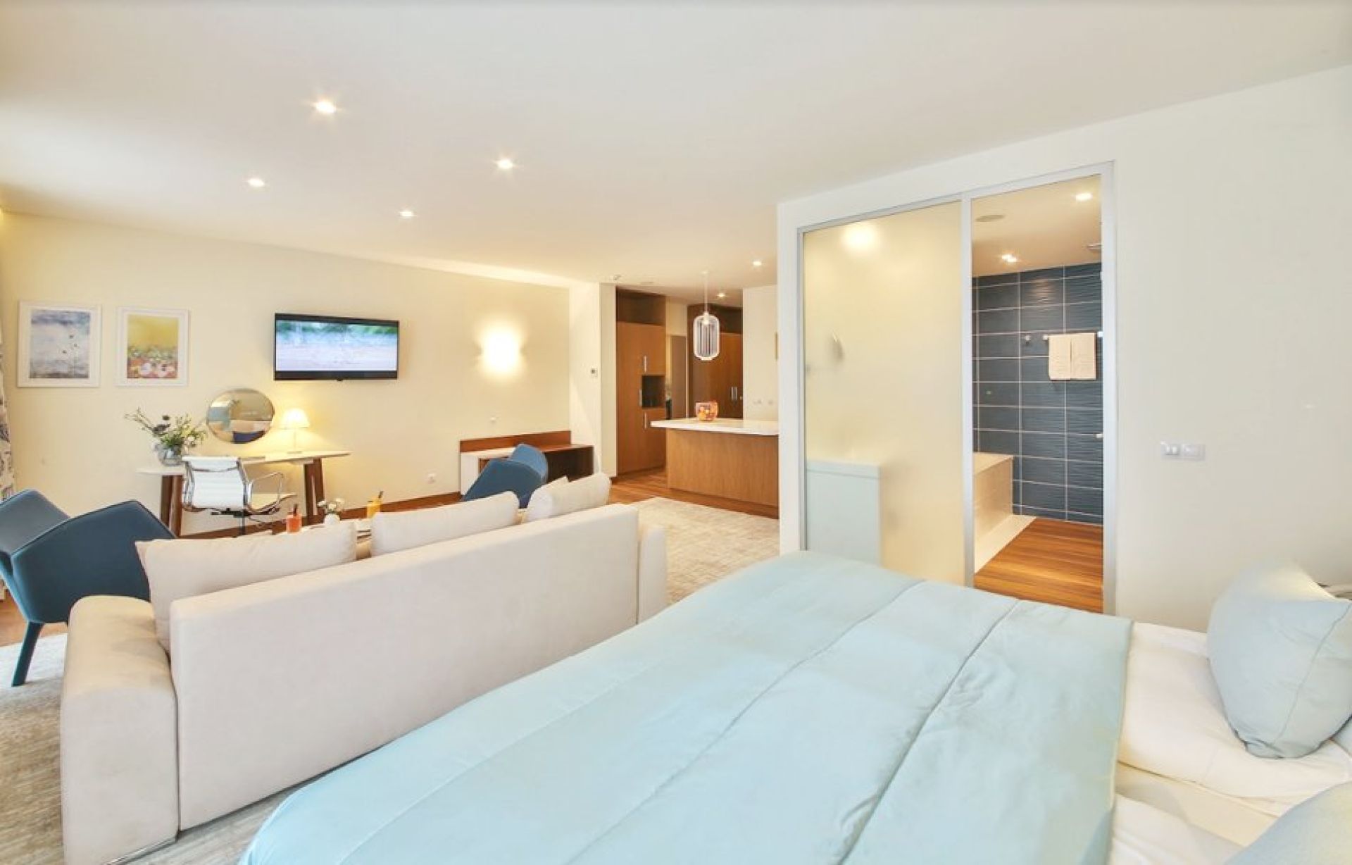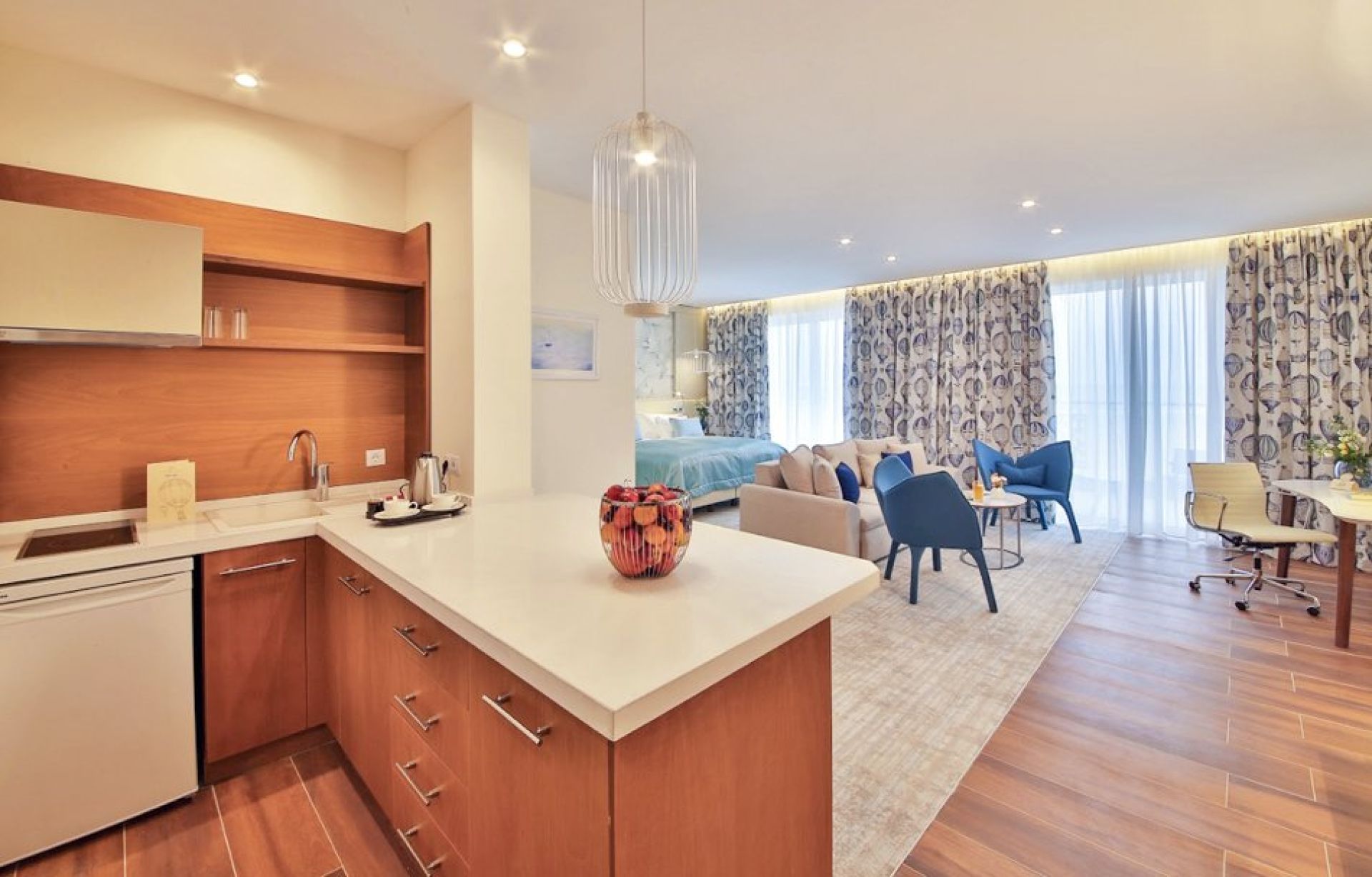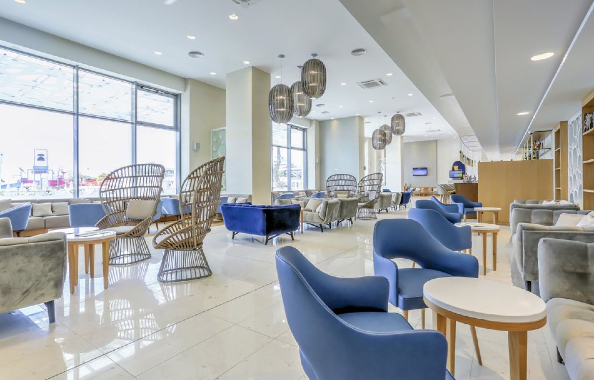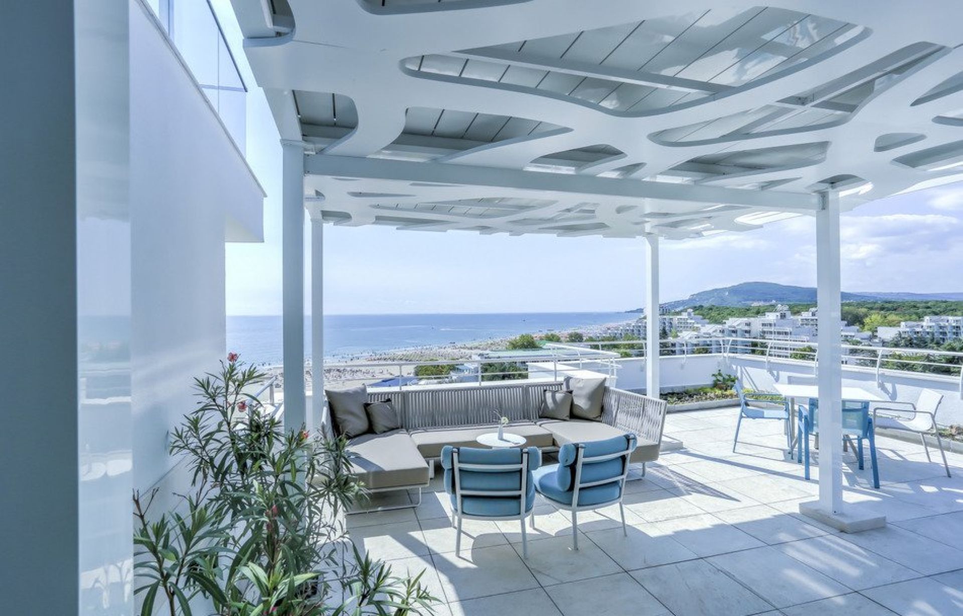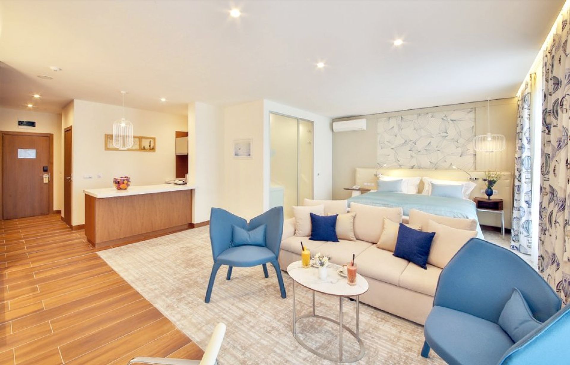 Дизайнът съчетава светли тонове и съвременни мебели, създавайки спокойна и уютна атмосфера за релакс след ден на плажа или забавления в курорта.