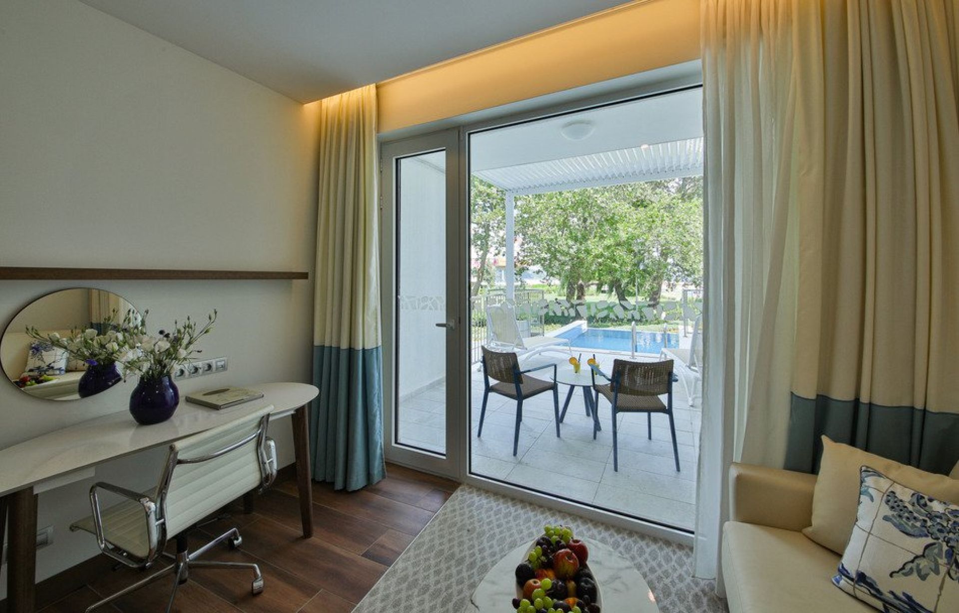 Гостите могат да избират между стаи с изглед към морето, парка или басейна. Апартаментите разполагат с допълнителна дневна зона и тераса, което ги прави идеални за семейства или по-дълъг престой.