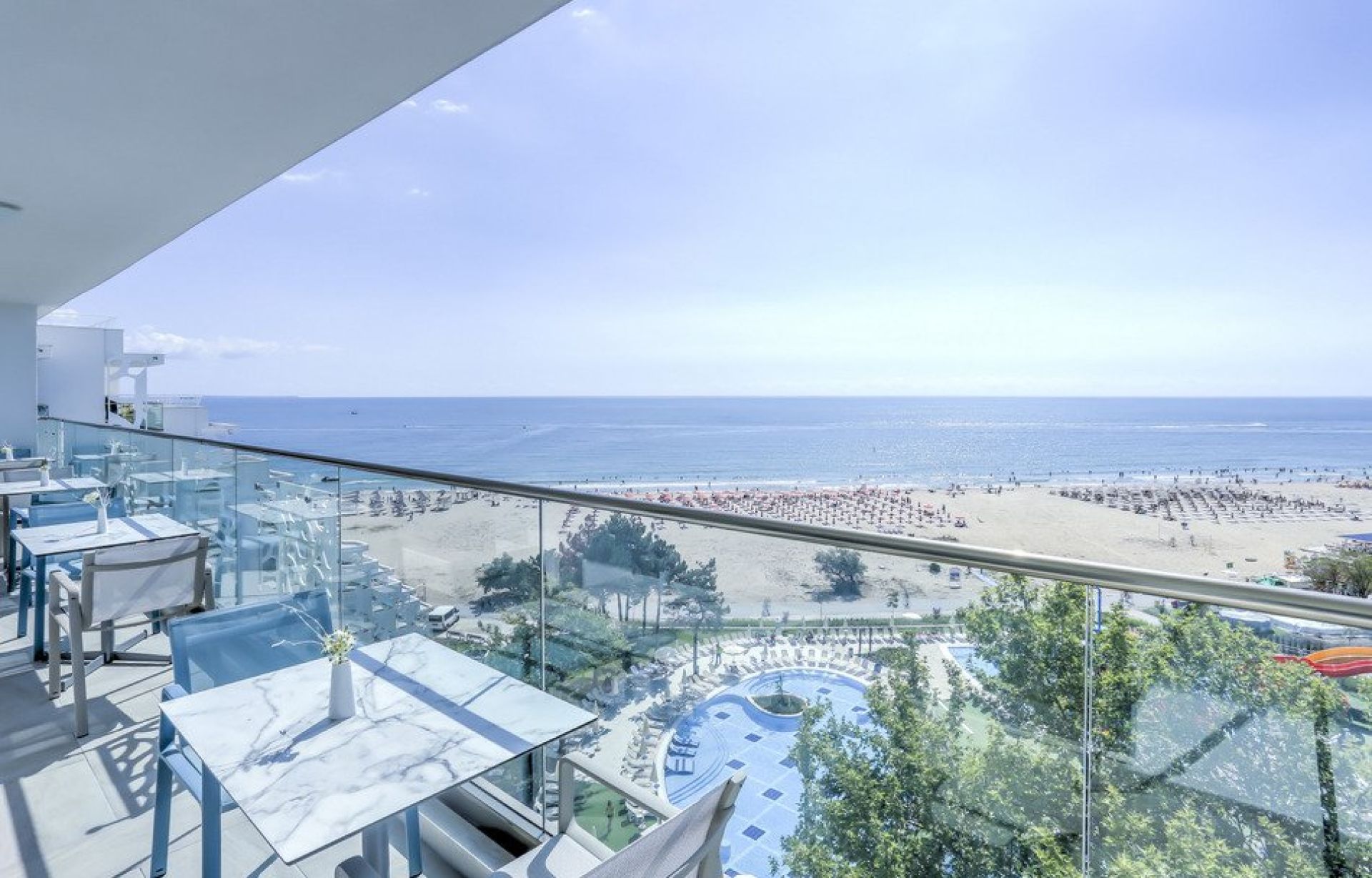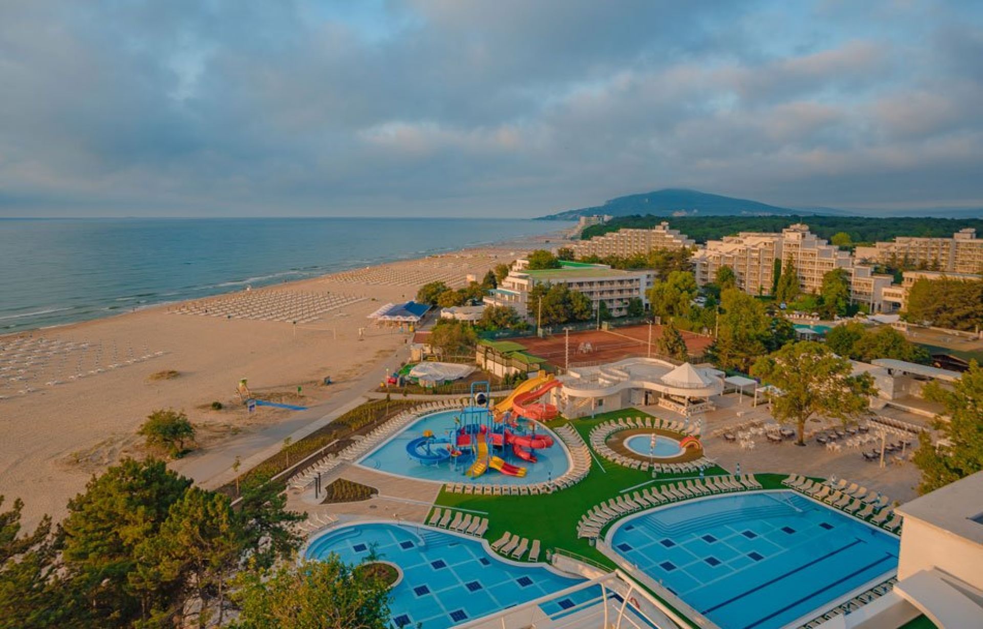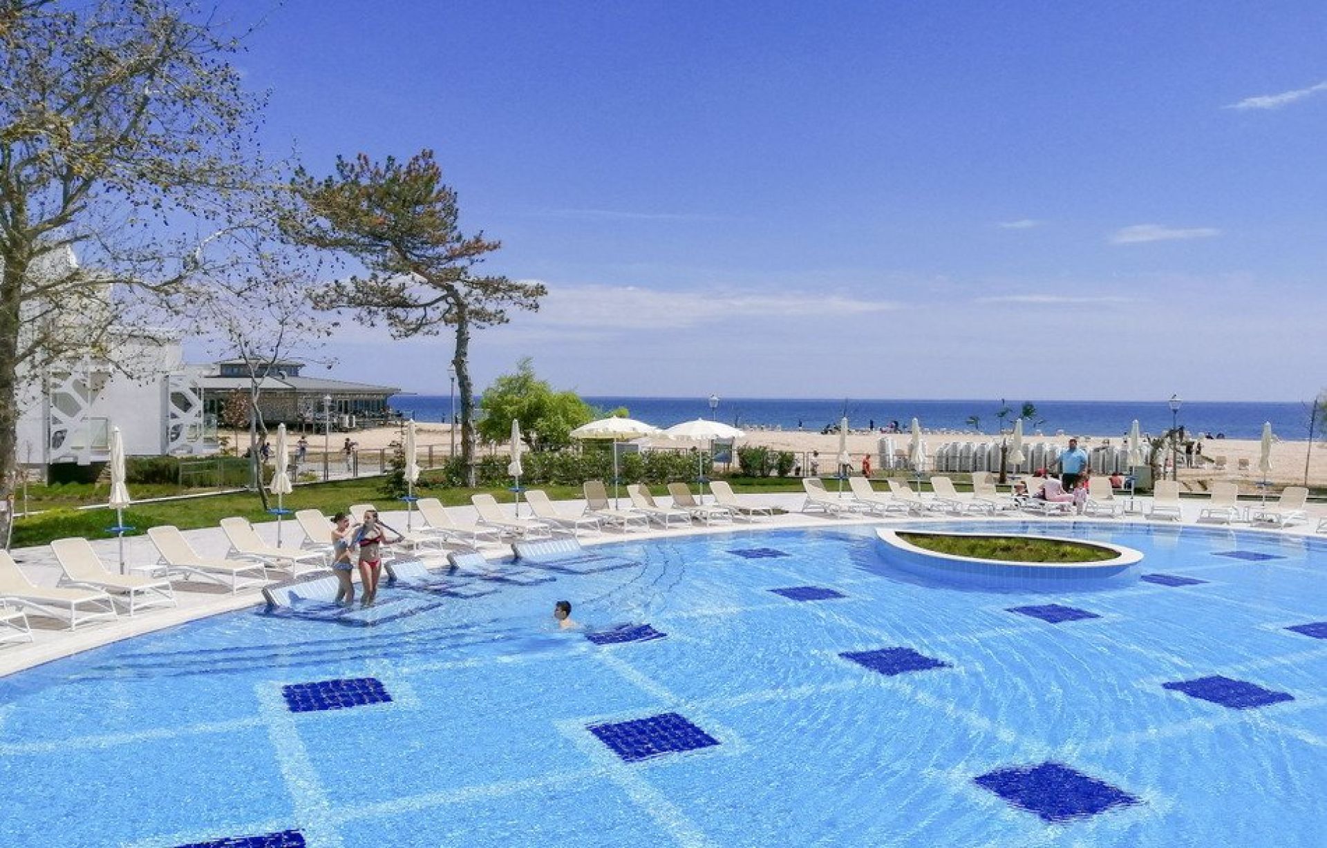 Разположението на хотела на първа линия на широкия плаж на Албена гарантира безопасно плуване и възможност за водни игри, докато родителите се наслаждават на почивката си.