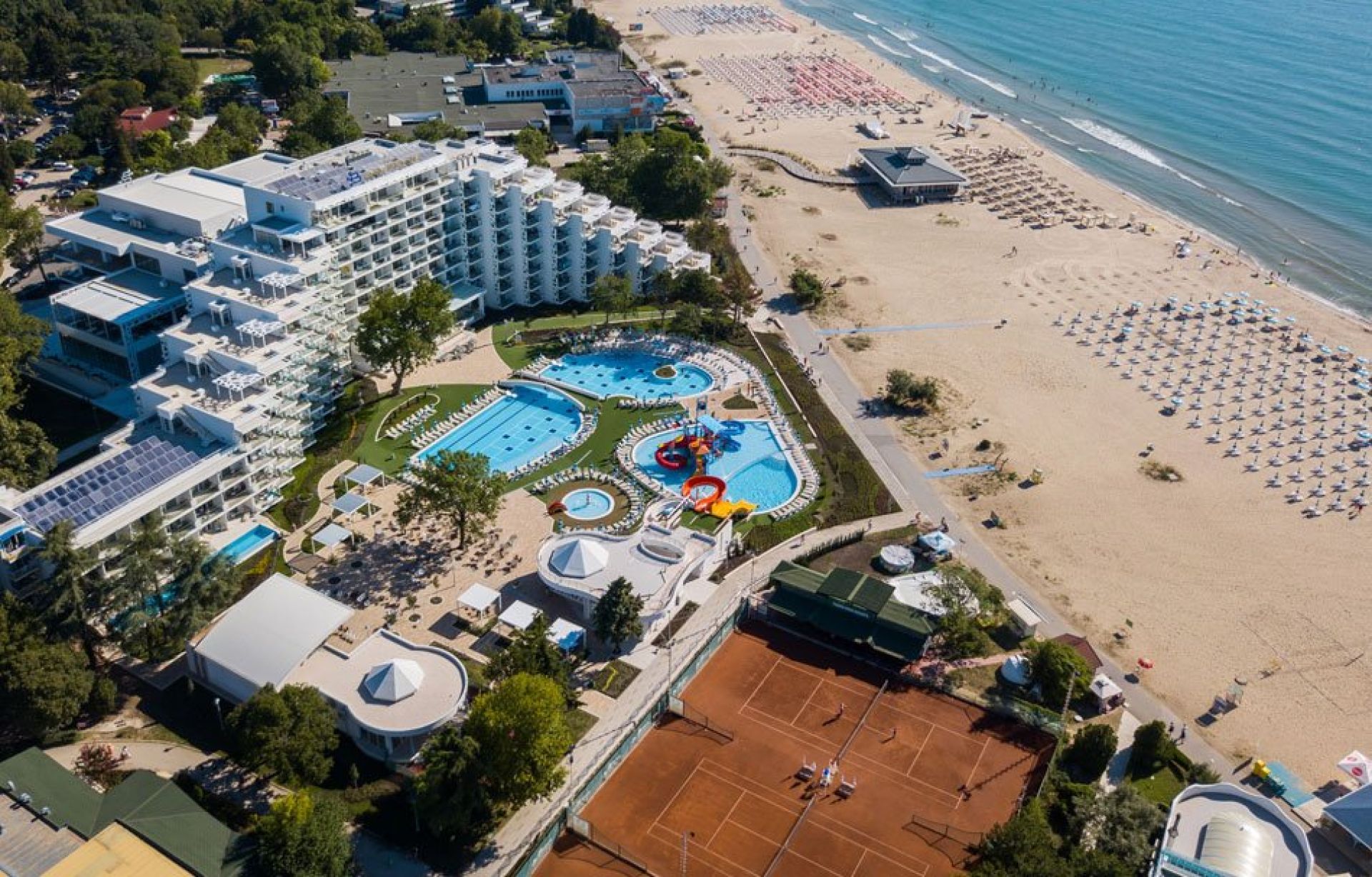 Гостите разполагат с шезлонги и чадъри, а зоната се поддържа ежедневно за максимален комфорт и чистота. Плажът е също отлична база за водни спортове и разходки по крайбрежната алея, която свързва хотела с центъра на курорта.
