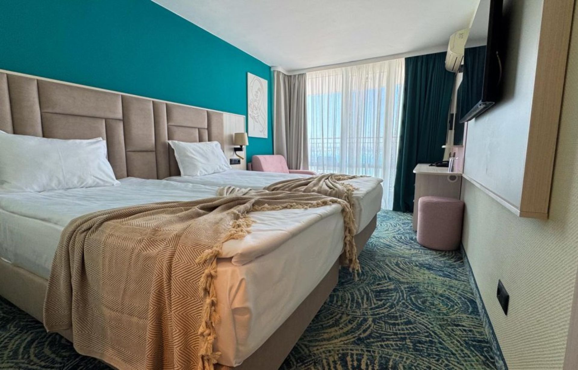 Повечето стаи имат балкон с гледка към морето или към зелени площи.