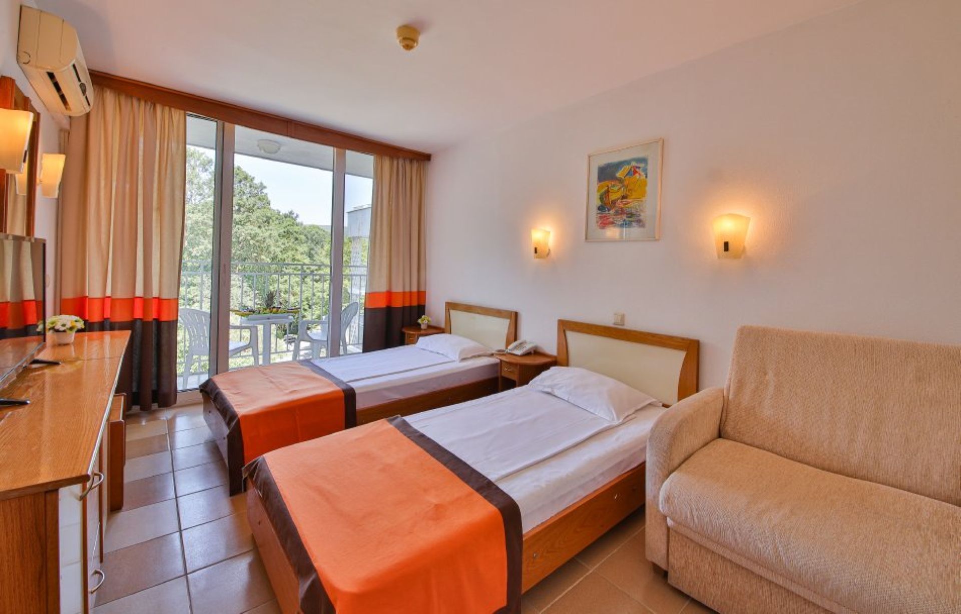 Двойни стаи – оборудвани с две единични легла, разтегателен фотьойл, климатик, LED телевизор с цифрова телевизия, телефон, баня с вана или душ и обзаведен балкон, който е идеално място за почивка след ден на плажа. Част от двойните стаи имат гледка към морето, а други – към природен резерват „Балтата“.