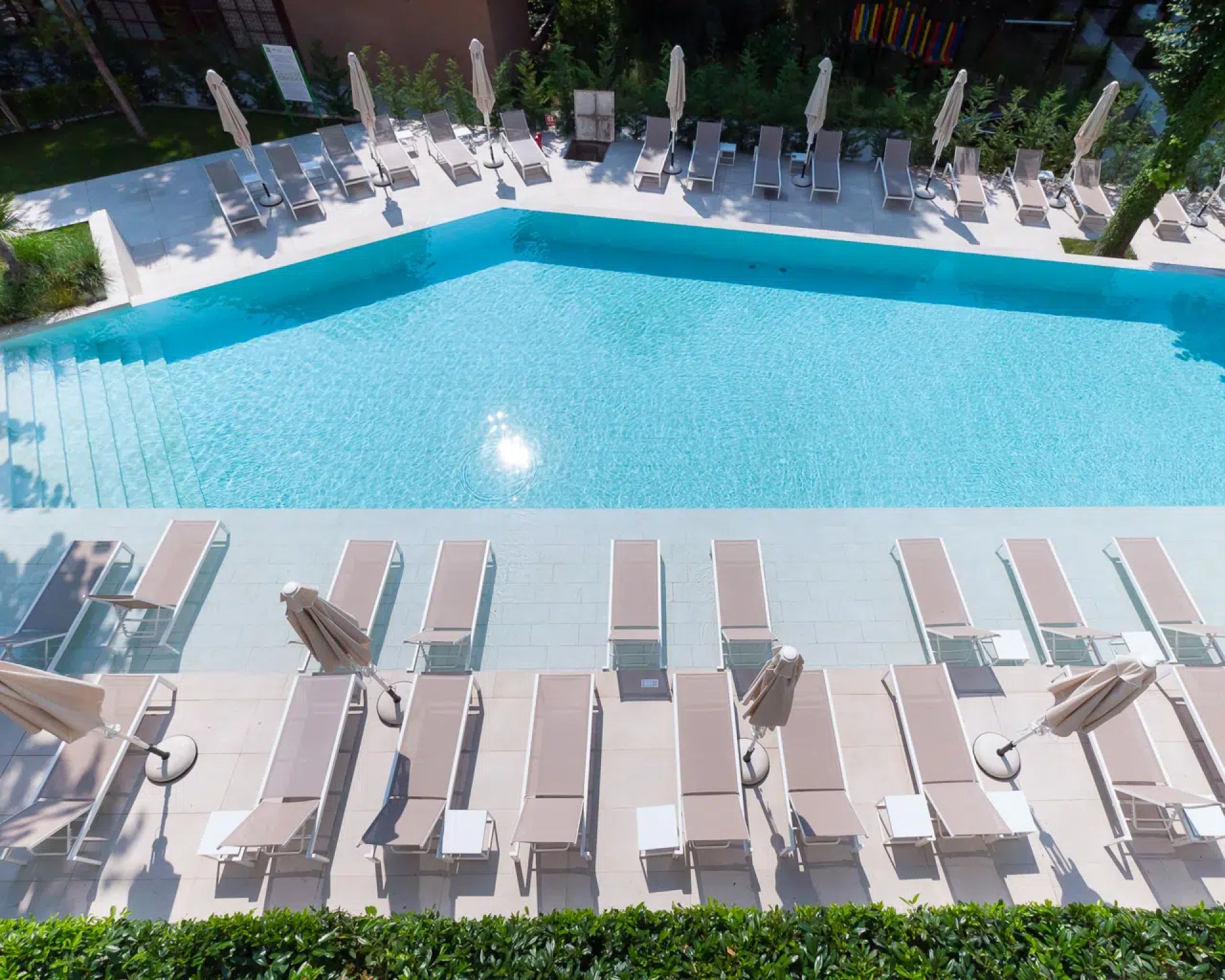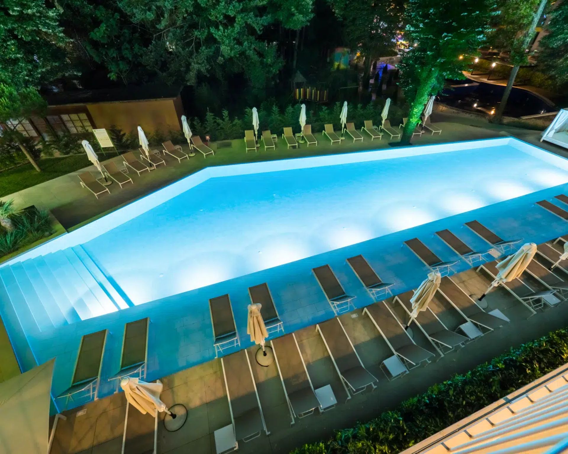 Открит басейн (сезонен) с шезлонги и чадъри.