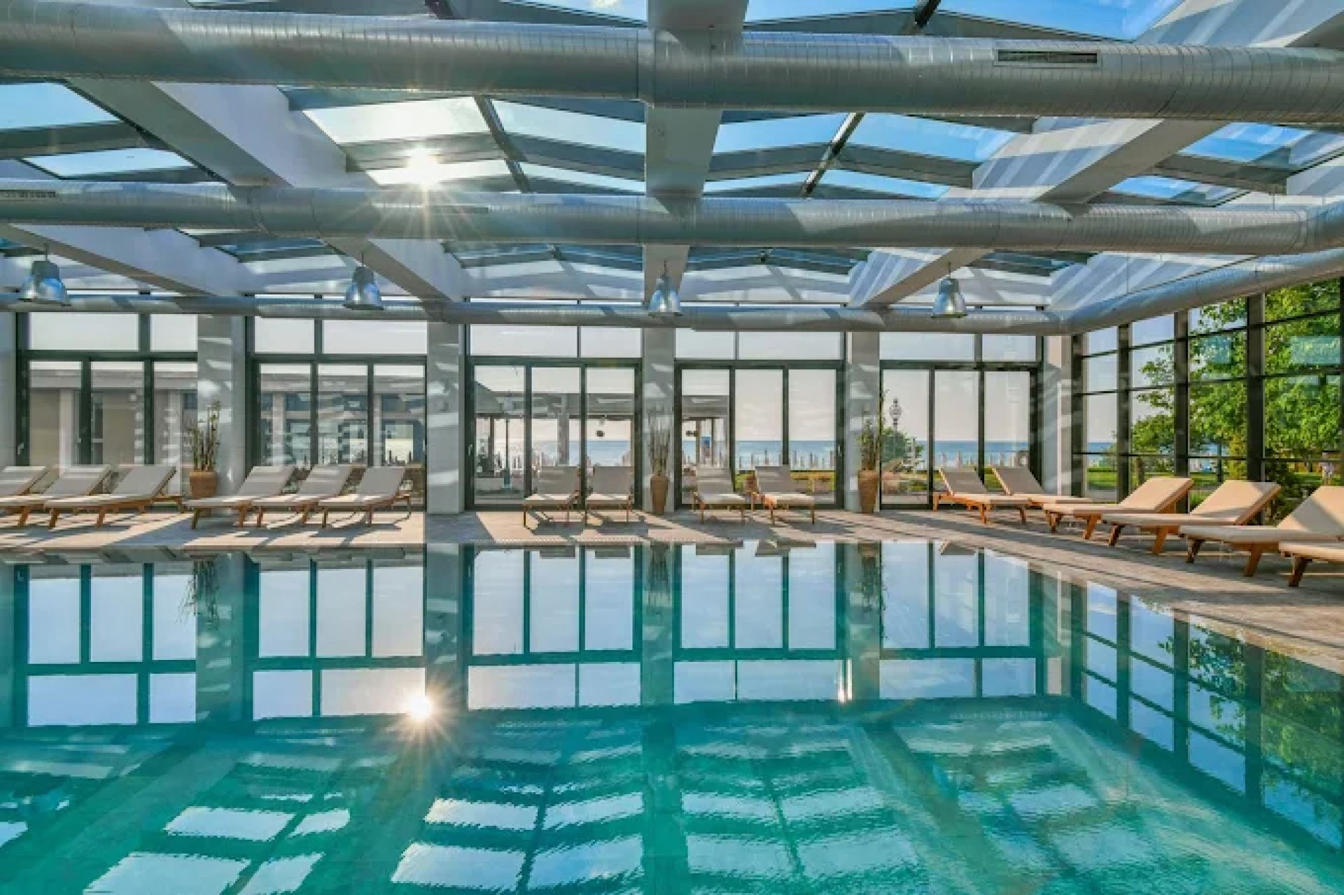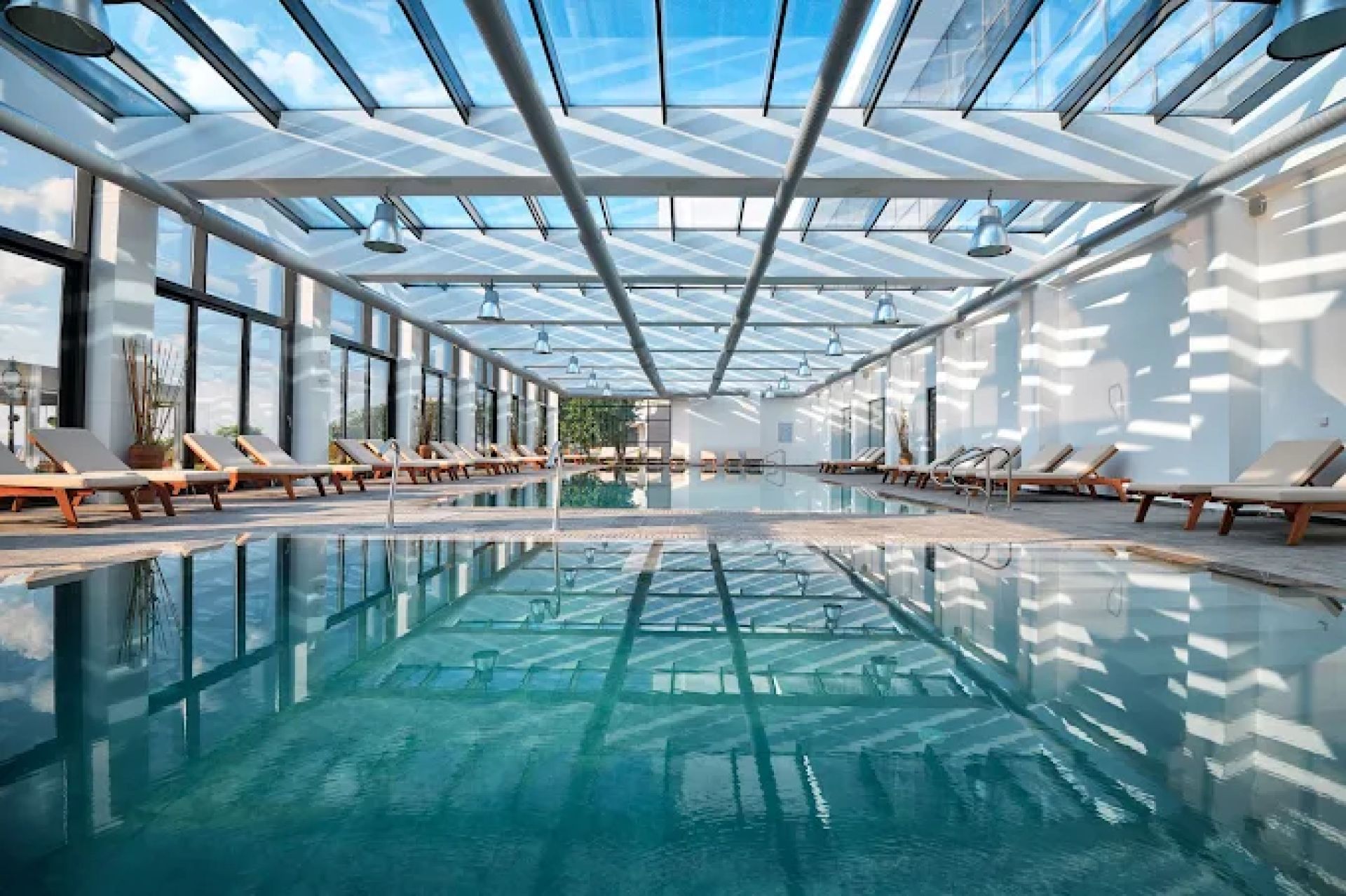 вътрешен отопляем басейн с големи остъклени прозорци