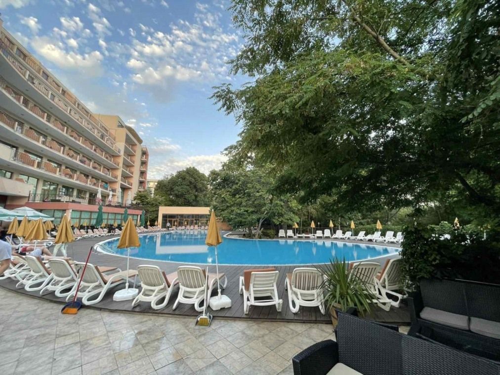 сезонен открит басейн с детска секция и безплатни шезлонги и чадъри до него;