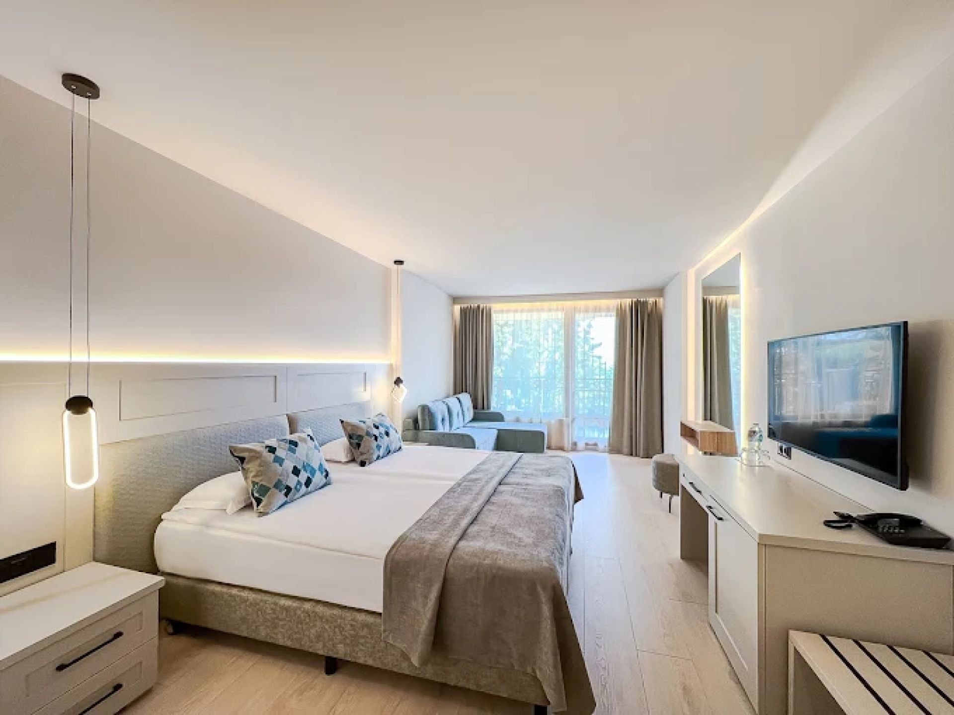 Всички помещения са обзаведени с климатик, балкон/тераса, телевизор, минибар, собствен санитарен възел и безплатен Wi-Fi.