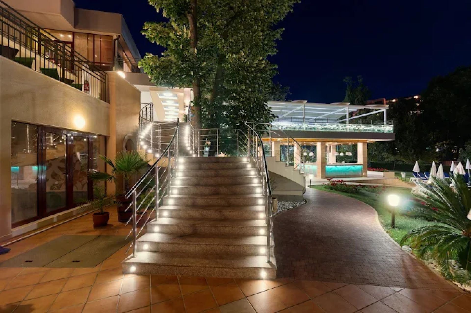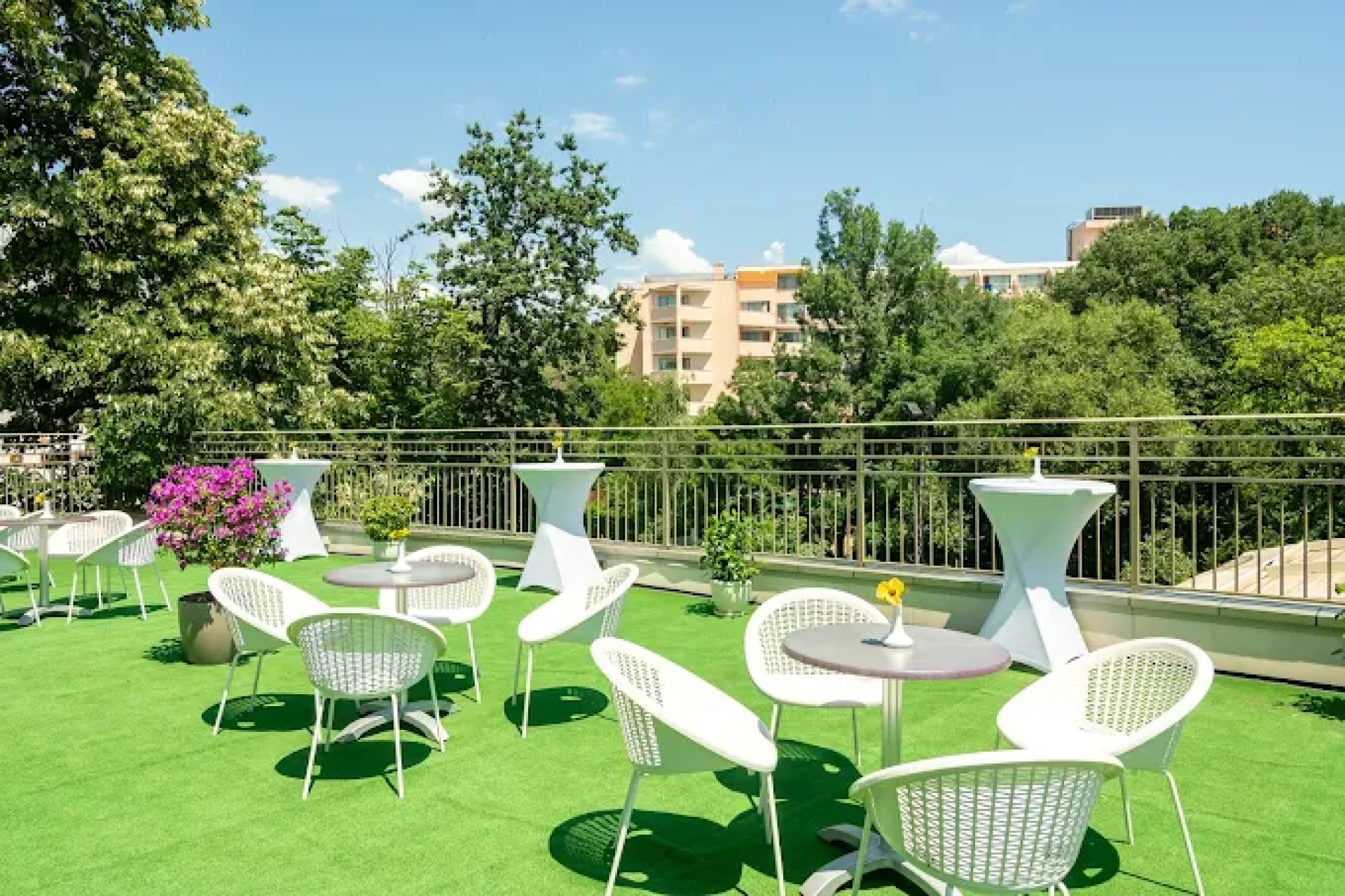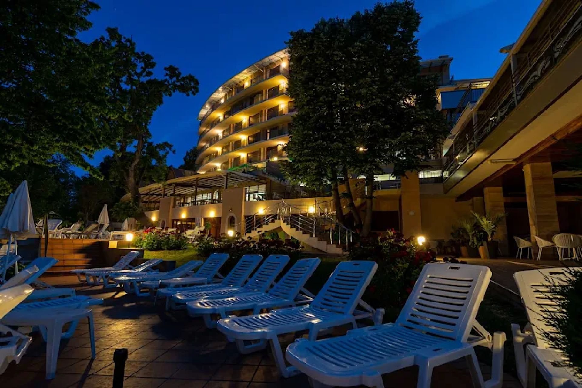 Хотелът разполага с голям външен плувен басейн на две нива с детска секция, шезлонги, чадъри и бар за освежаване. В хотелската градина се намират уютни кътове за релакс. Плажът на Златни пясъци е на около 400–450 м пеша, с чист пясък и плавен вход в морето.