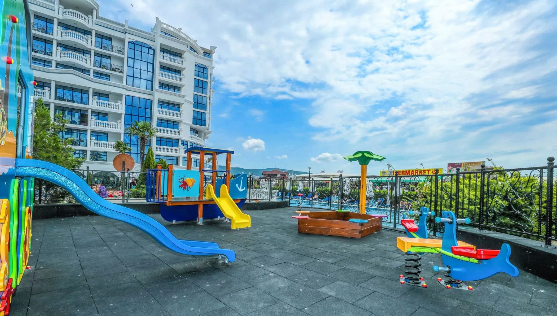 Детска площадка и зелени площи за игра.