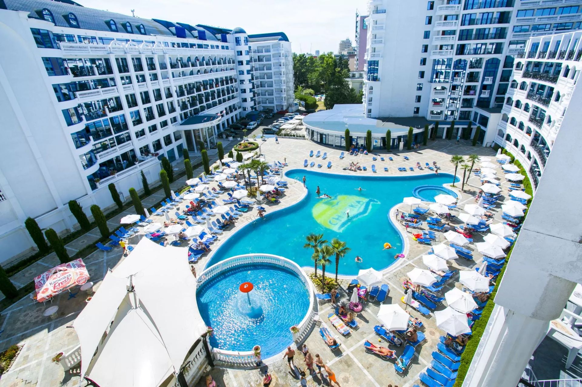 Хотелът е буквално на плажа (20 – 50 м), с директен достъп до златистия пясък на Слънчев бряг. В близост има плажни услуги, чадъри и шезлонги, които обикновено са срещу такса.