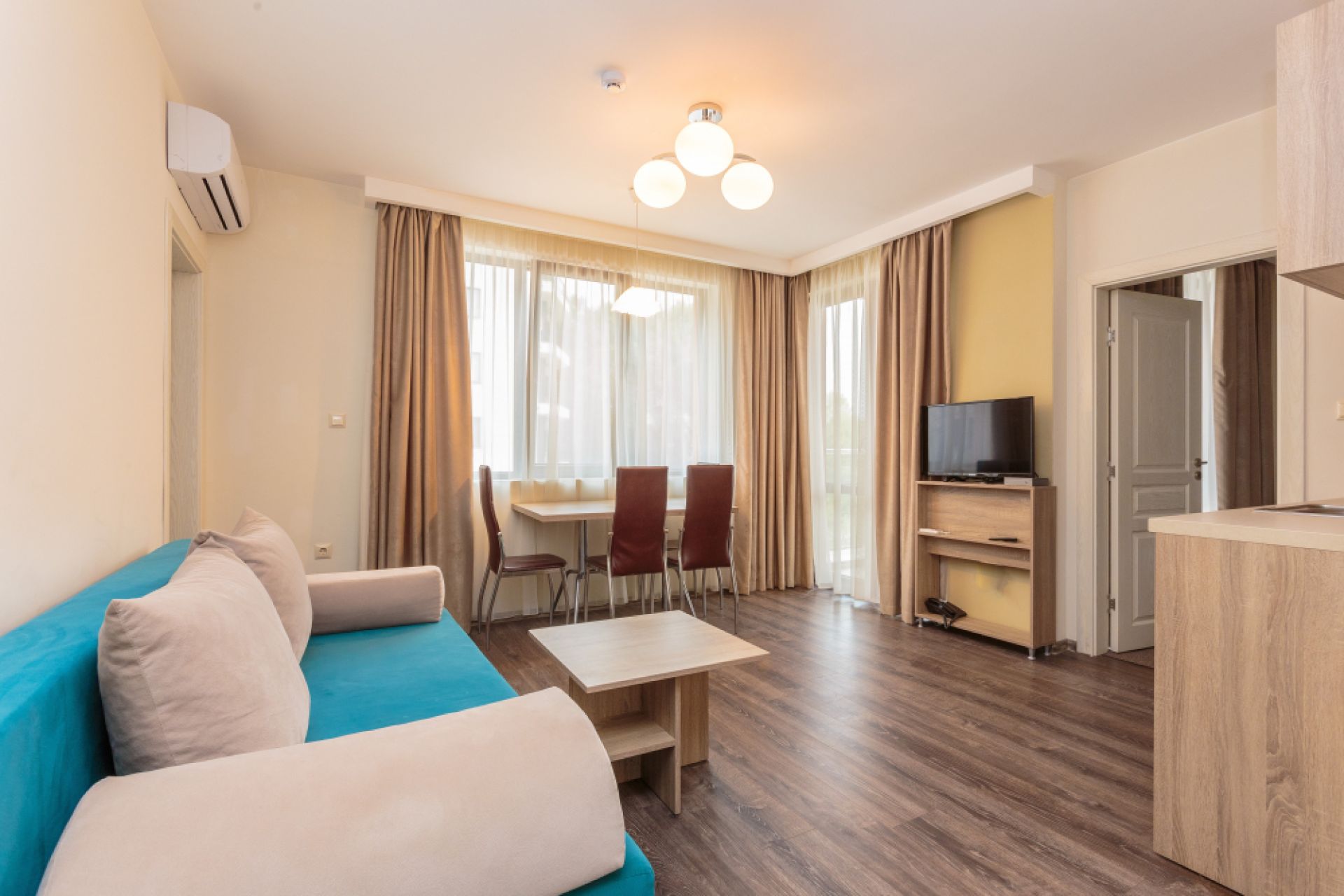 Апартаментите предлагат допълнително пространство с отделена спалня и дневна зона за по‑удобен престой.