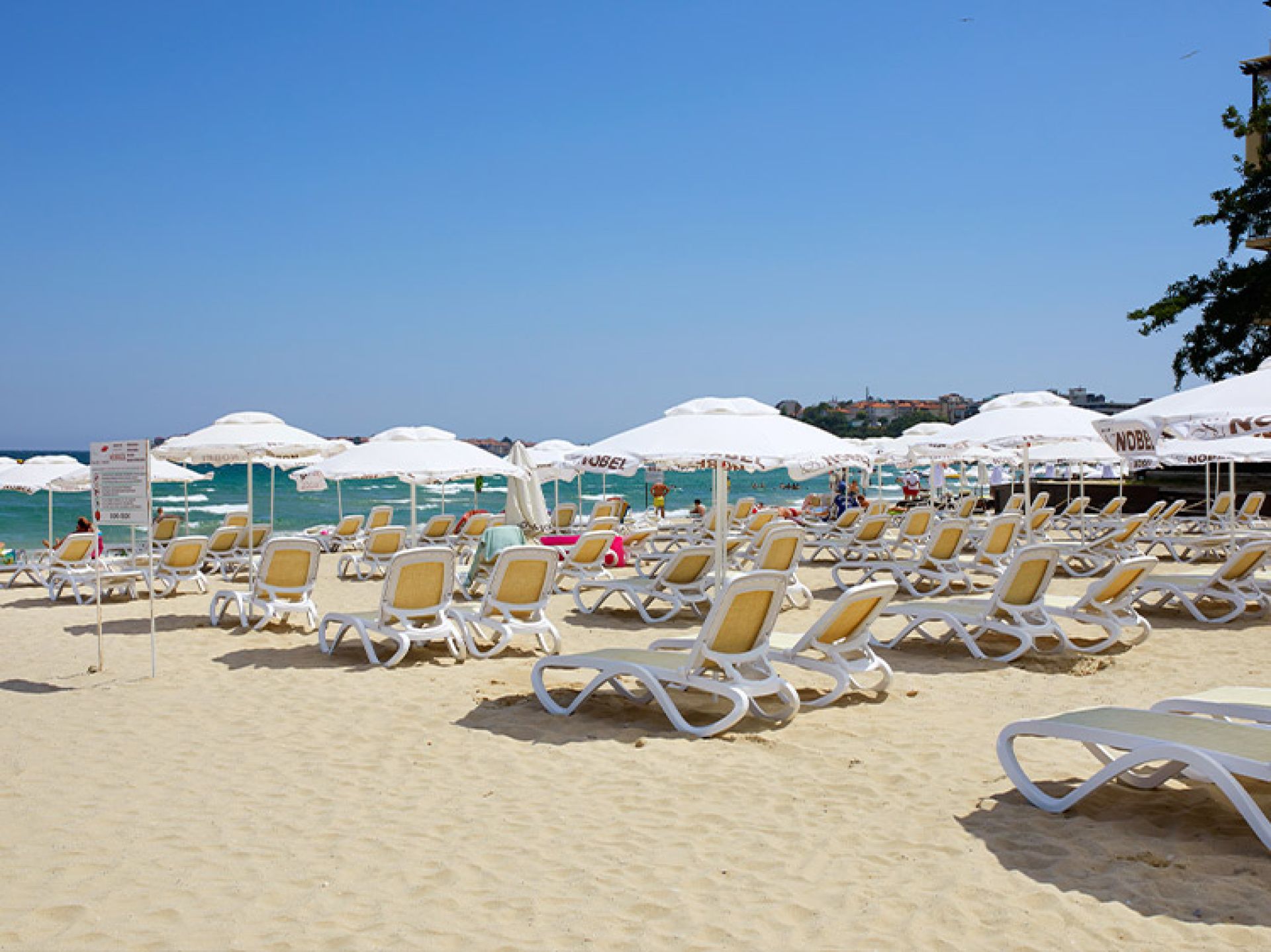 Хотелът разполага със плажна зона с шезлонги и чадъри, разположена сред характерните пясъчни дюни на Слънчев бряг. Това осигурява бърз и лесен достъп до морето всеки ден.