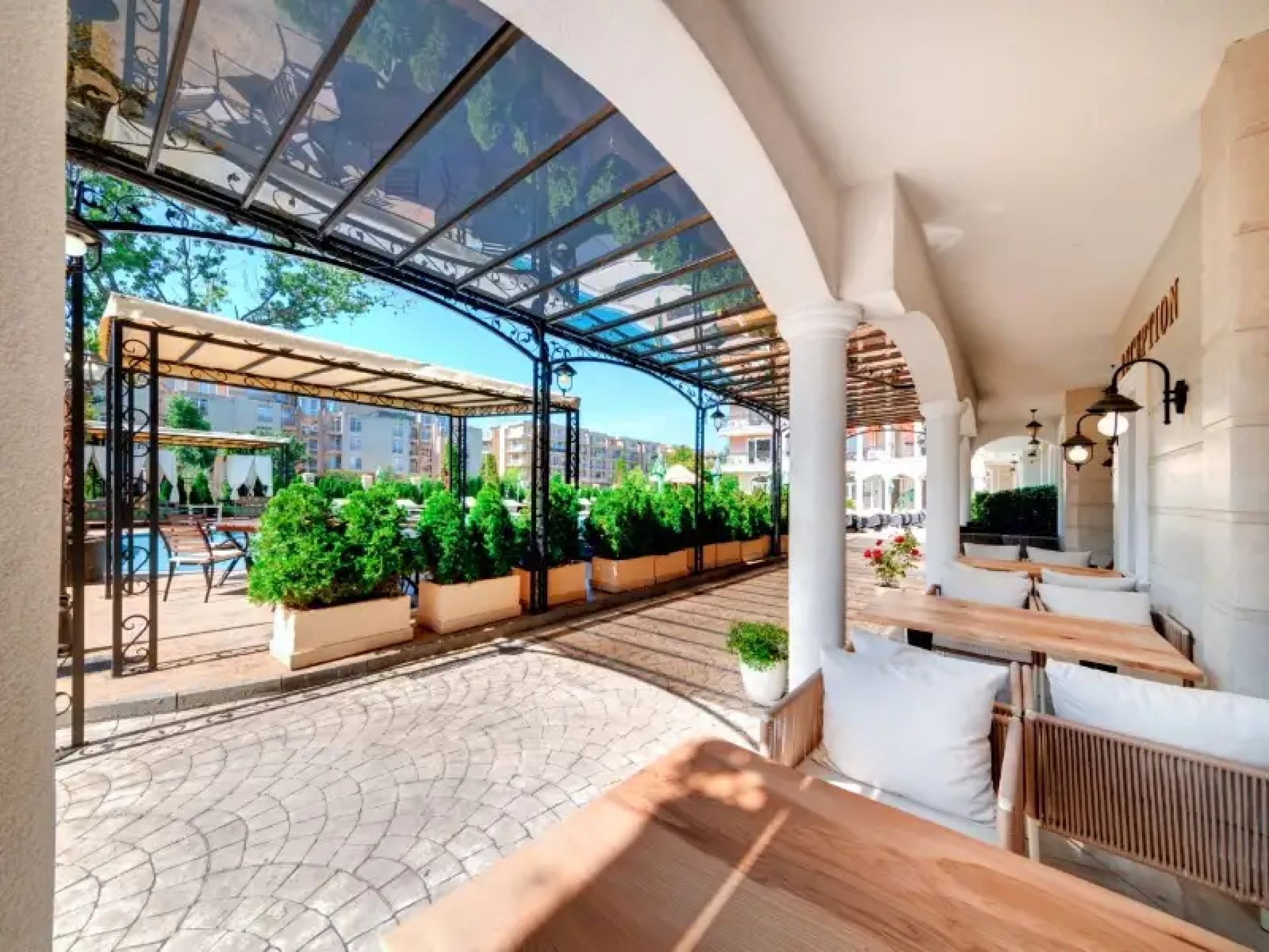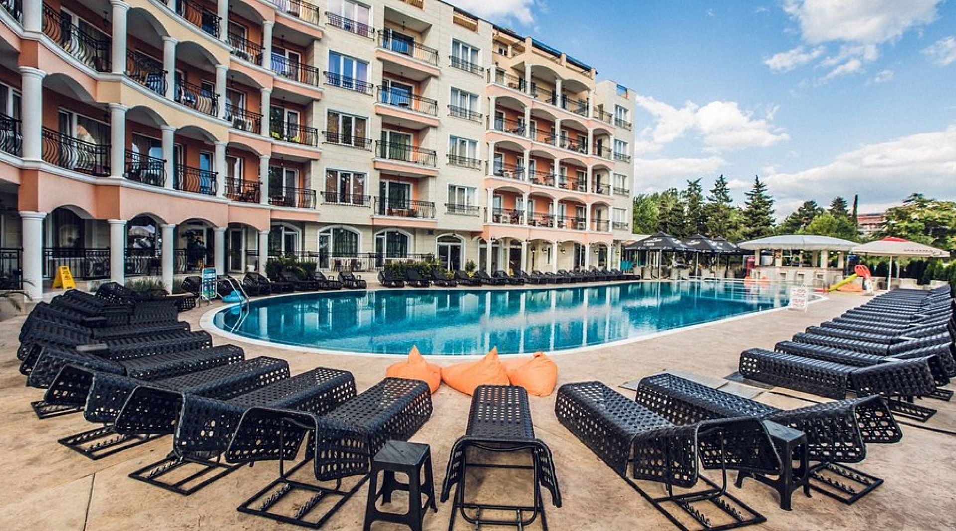 Хотелът е на пешеходно разстояние от широк пясъчен плаж на Слънчев бряг – приблизително 150 м, което позволява лесен достъп до плажната ивица без транспорт.
