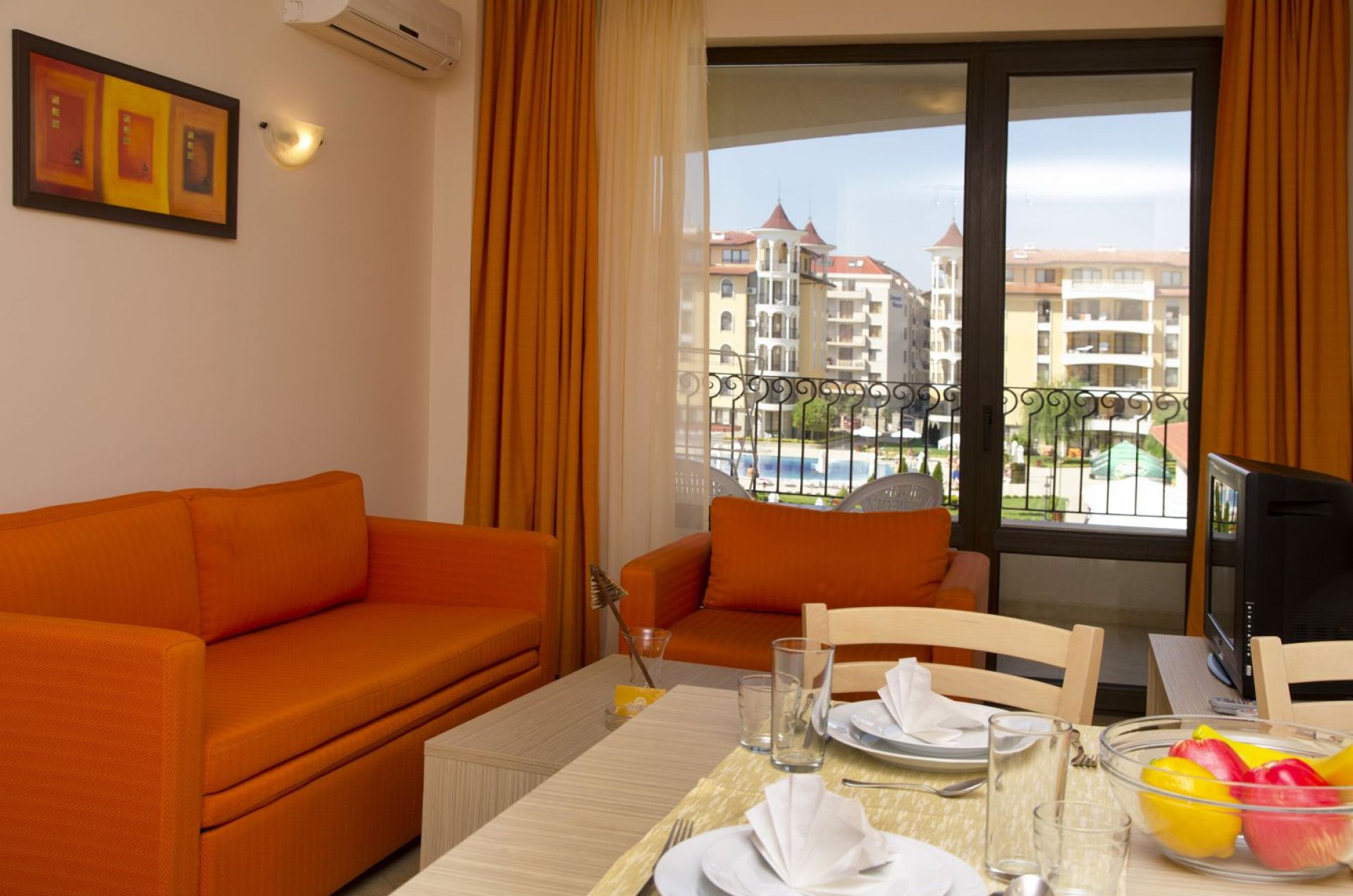 Стаите и апартаментите в Royal Sun са проектирани да предлагат повече свобода и пространство, отколкото стандартна хотелска стая. Повечето помещения включват климатик, частичен кухненски кът или минихладилник, балкон или тераса, телевизор и други основни удобства, което ги прави подходящи както за кратка лятна почивка, така и за по‑дълъг престой. Много от гостите описват пространството като практично и с всички необходими удобства за ежедневен престой.